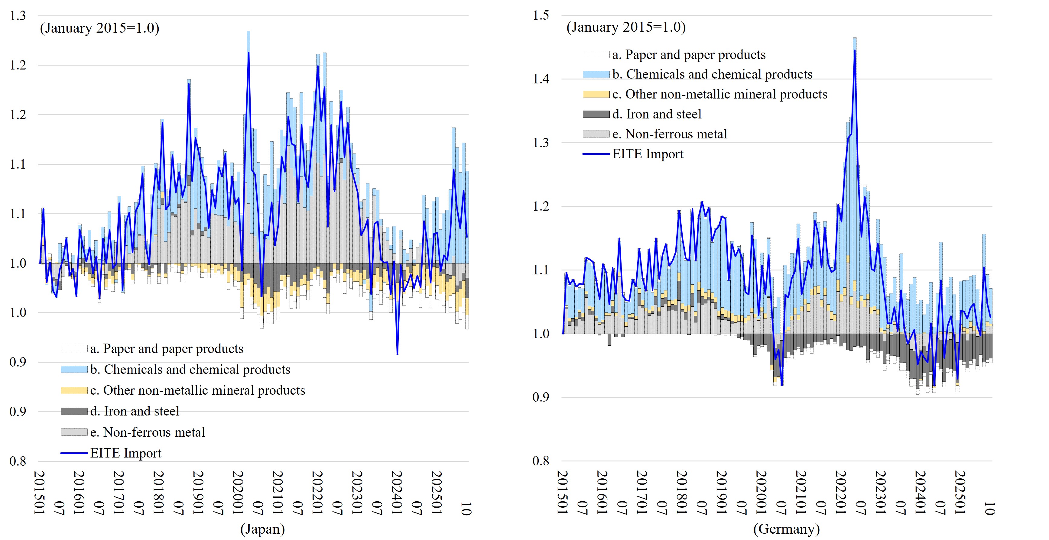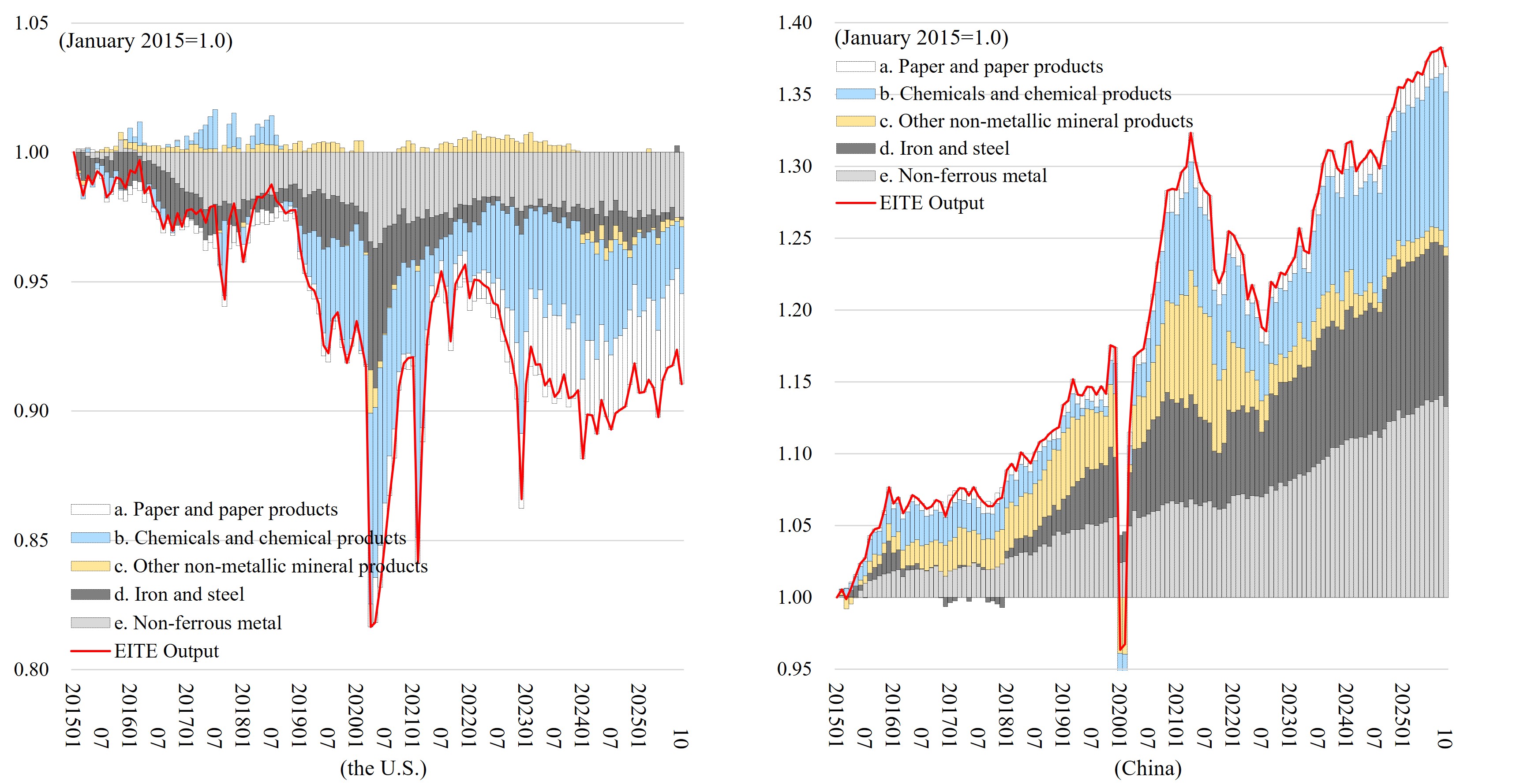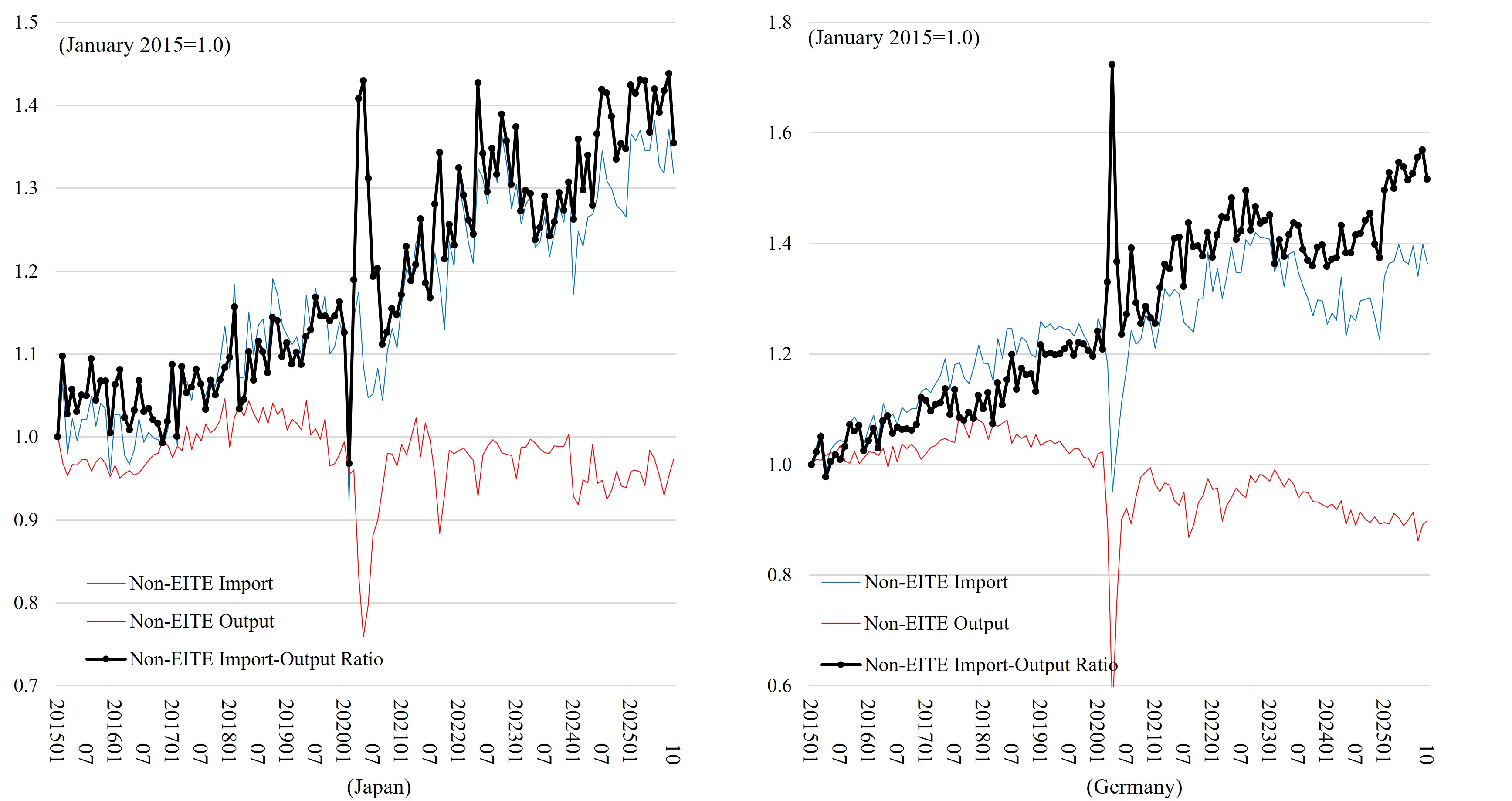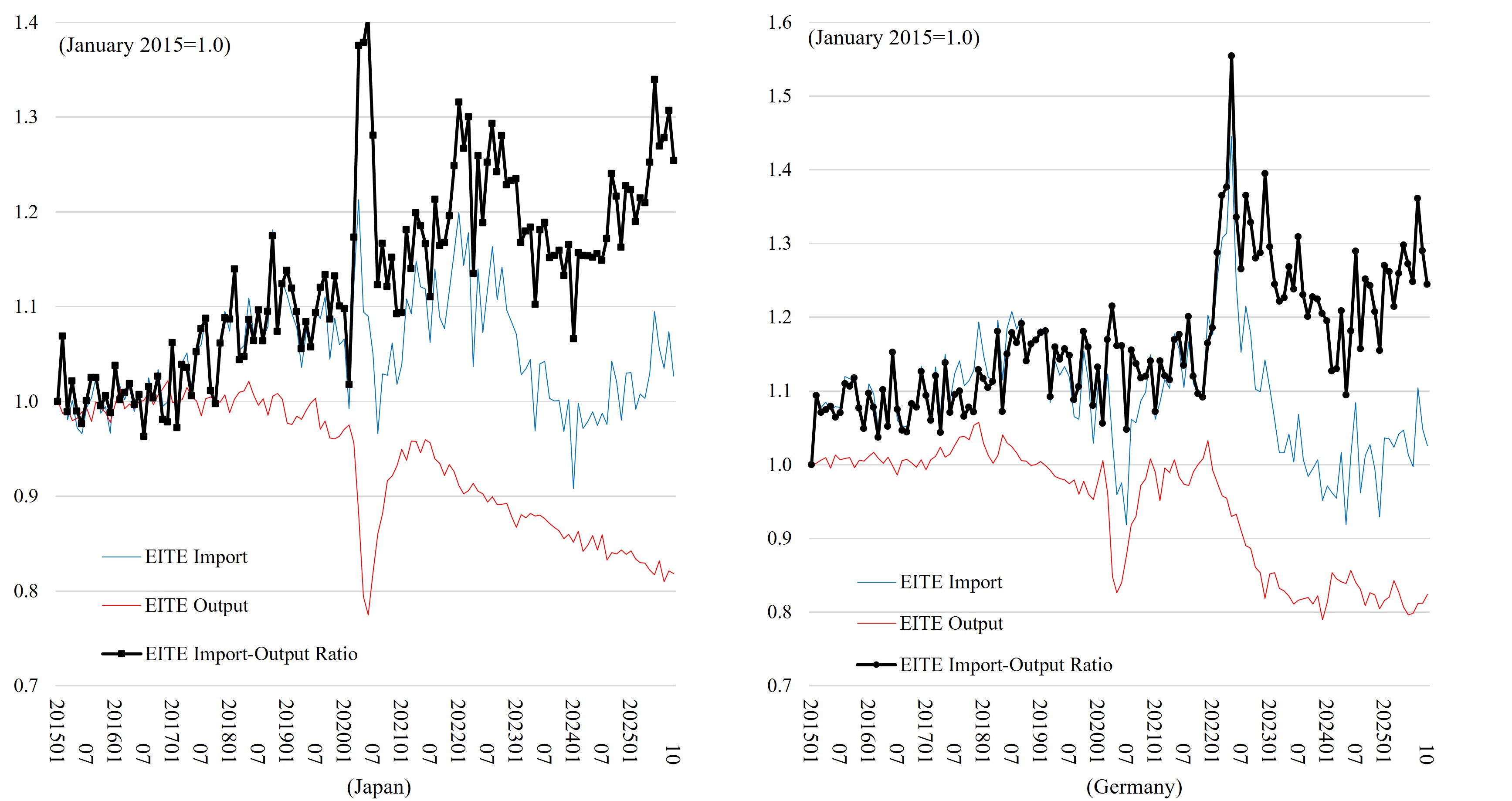 Unit: Index (import and output in 2015=1.0). Period: January 2015–October 2025 (the bold line represents the 13-month moving average). The Import-to-Output Ratio is defined as the Import Index divided by the Output Index. Because the absolute scales of imports and output differ, caution is advised when comparing relative index trends between EITE and Non-EITE sectors.