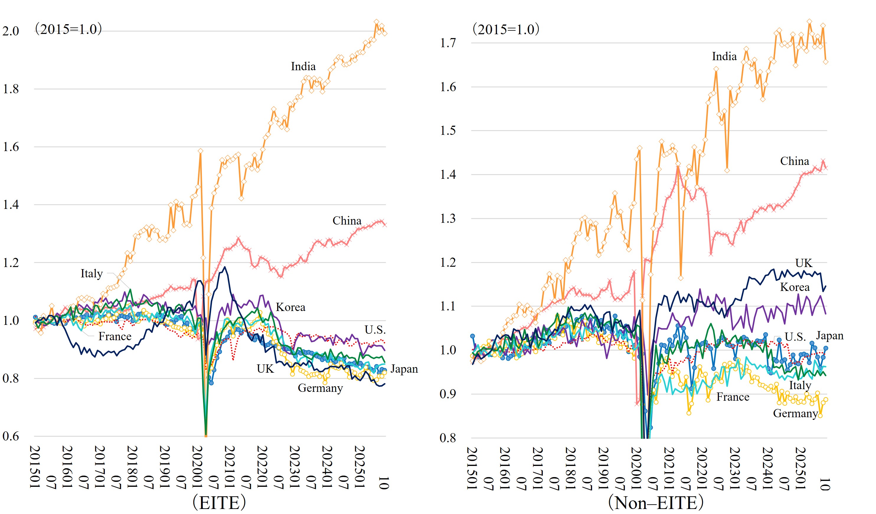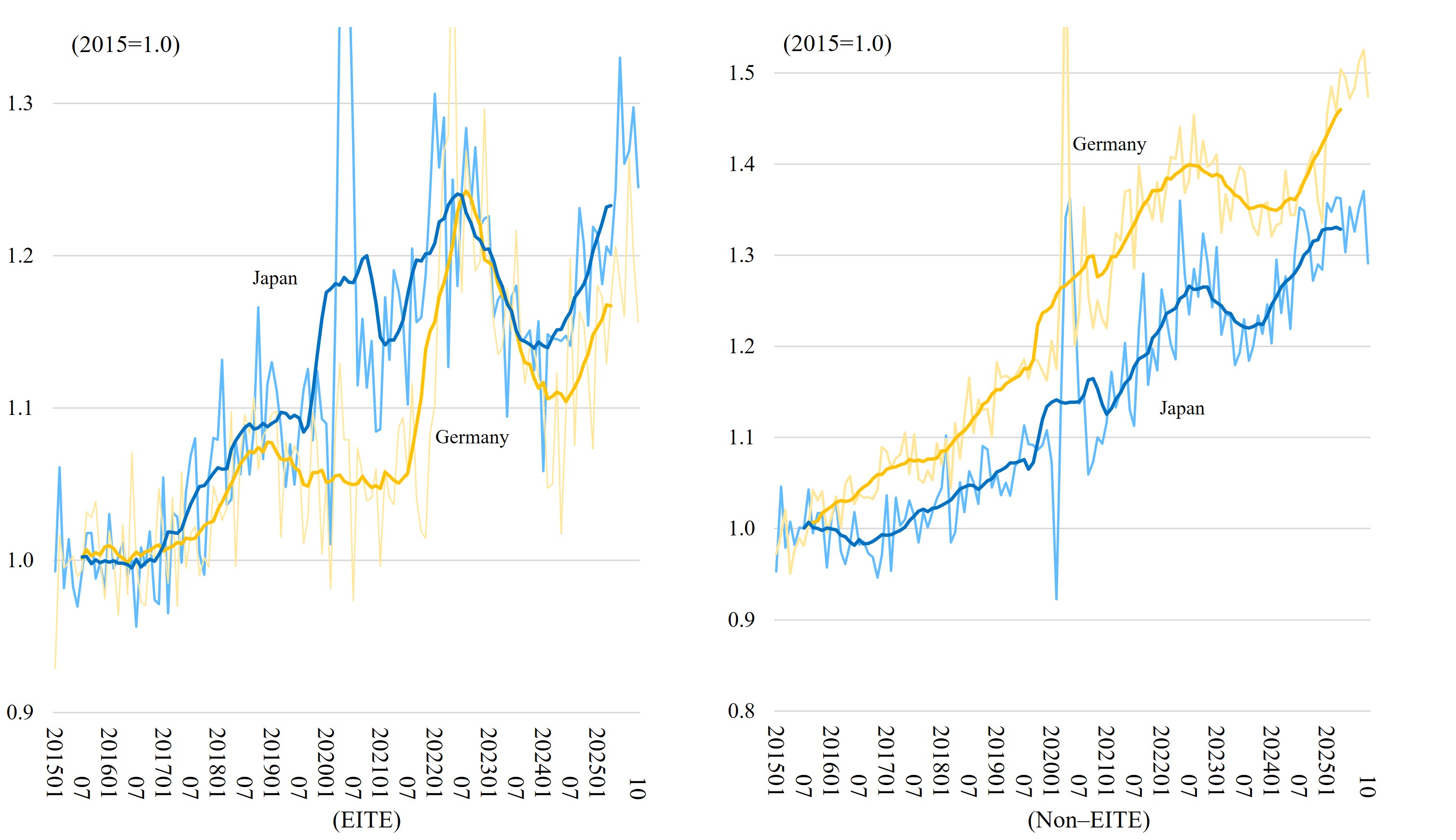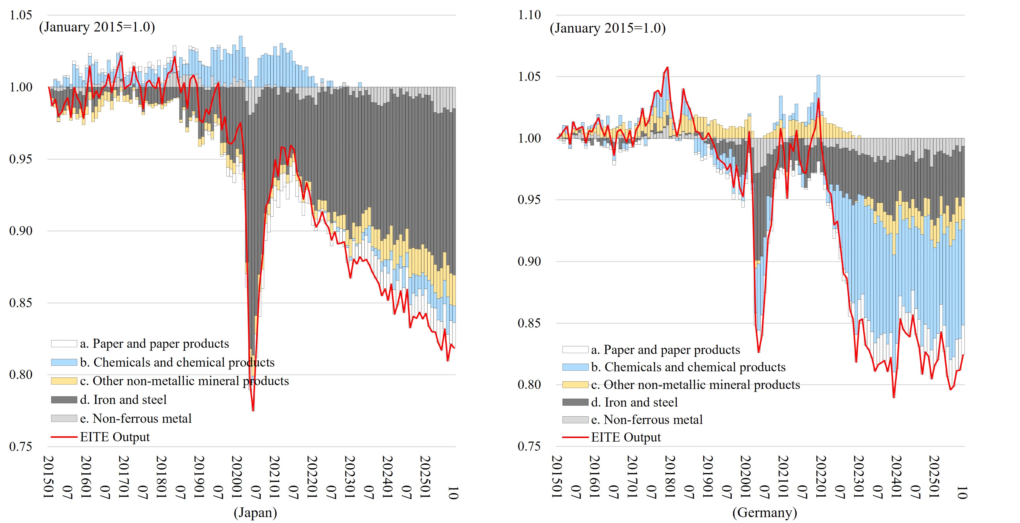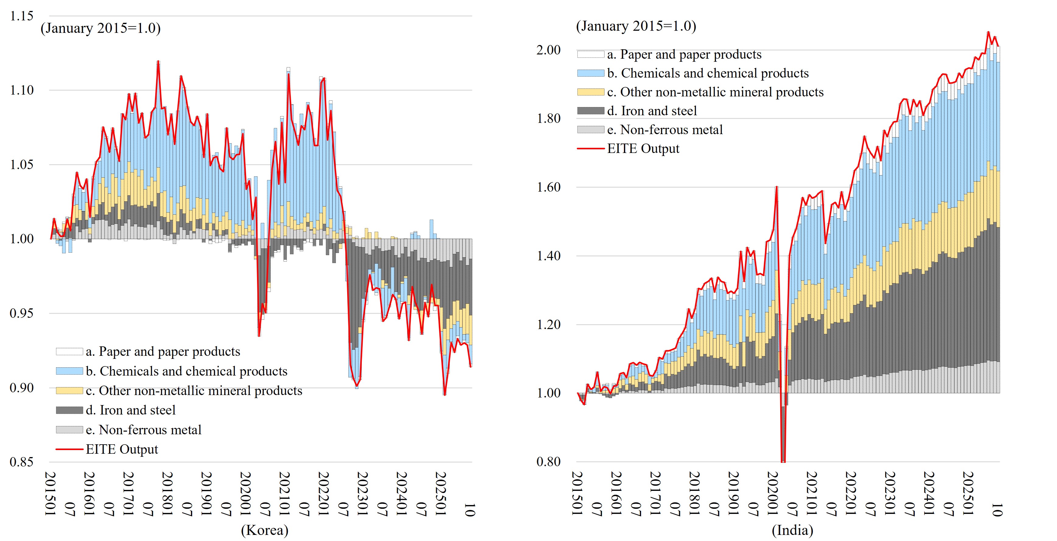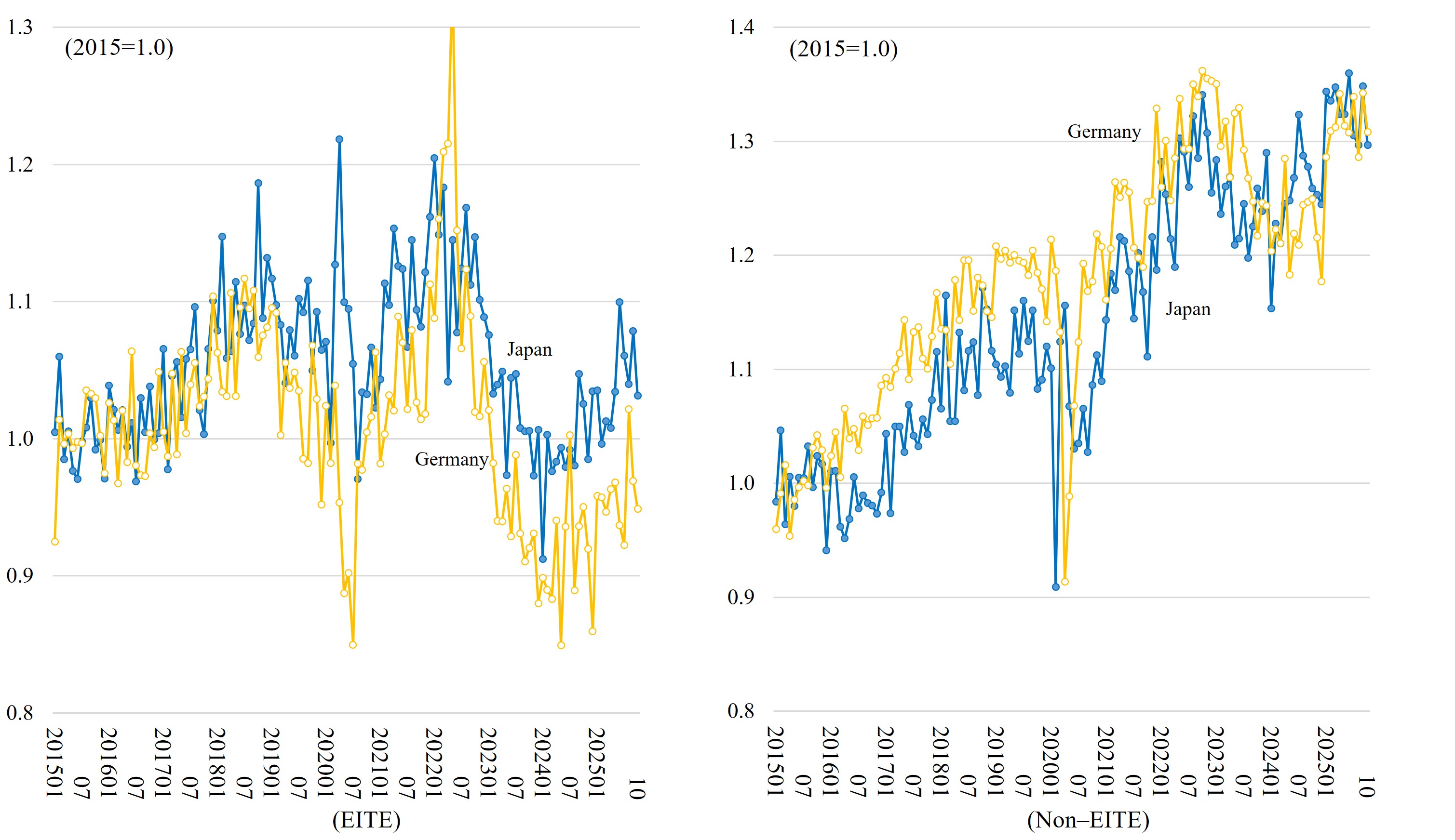 Unit: Index (import and output in 2015=1.0). Period: January 2015–October 2025 (the bold line represents the 13-month moving average). The Import-to-Output Ratio is defined as the Import Index divided by the Output Index. Because the absolute scales of imports and output differ, caution is advised when comparing relative index trends between EITE and Non-EITE sectors.