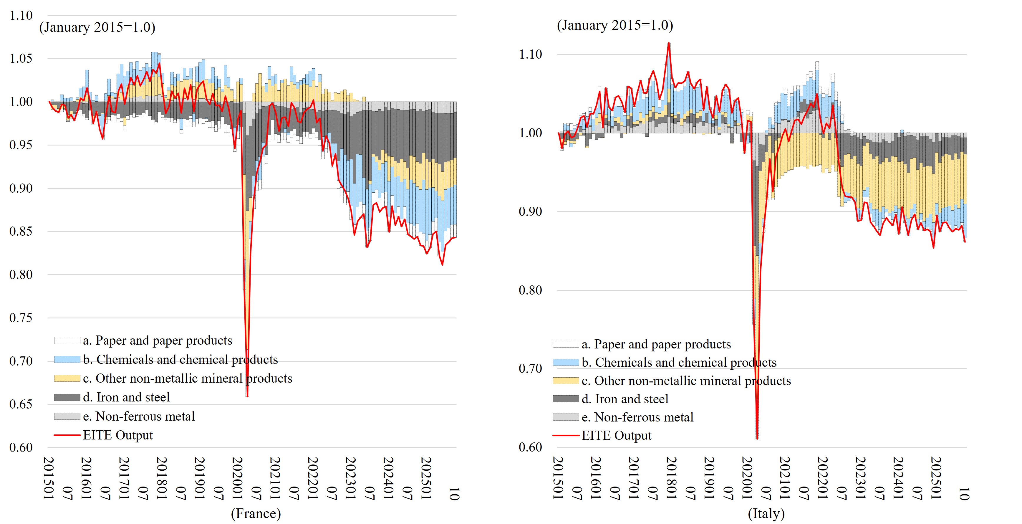 The ECM provides a high-frequency indicator — Real Unit Energy Cost (RUEC) and Real Price Level Index for energy (Real PLI) — to measure and compare real energy cost differentials across nine countries: four in Asia (China, India, Japan, and Korea), and four in Europe (France, Germany, Italy, and the UK), and the U.S. The ECM also releases the EITE (Energy-Intensive Trade-Exposed) Output Index.