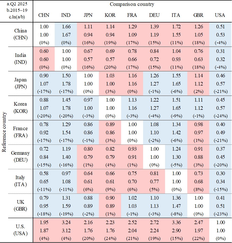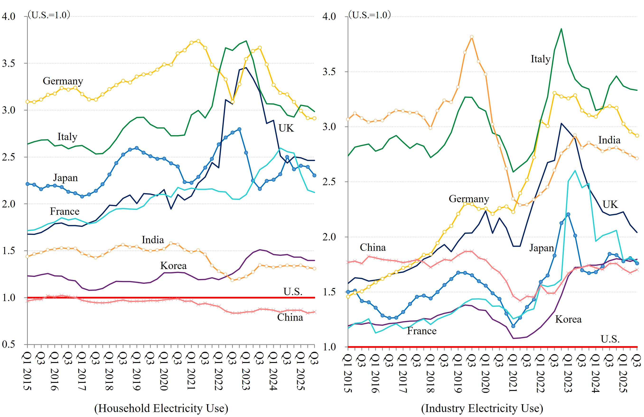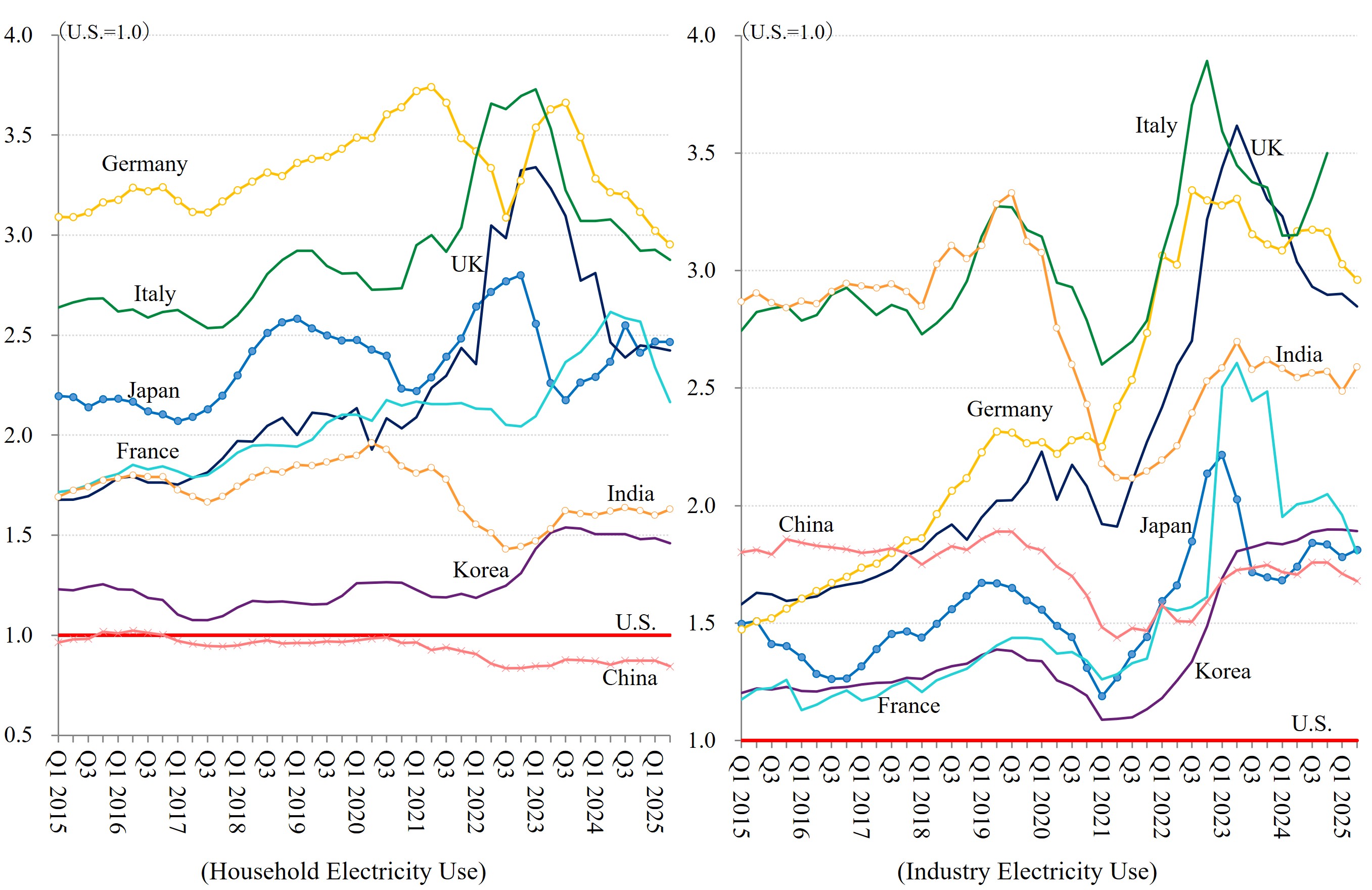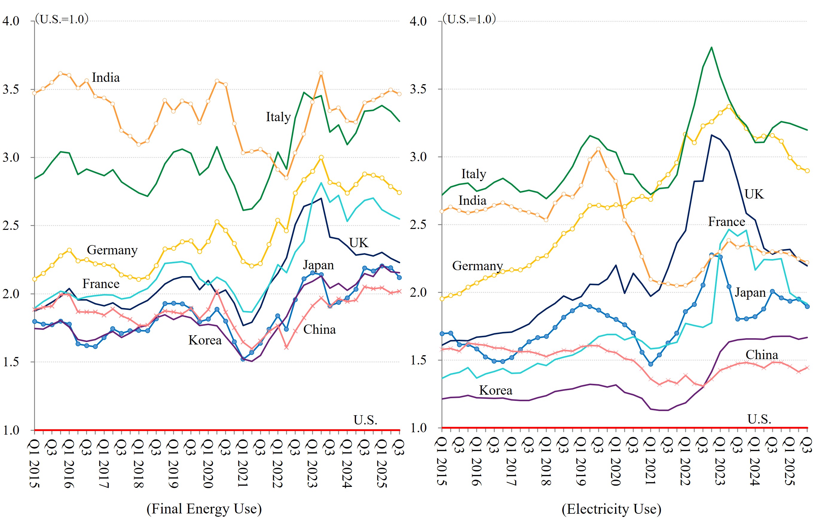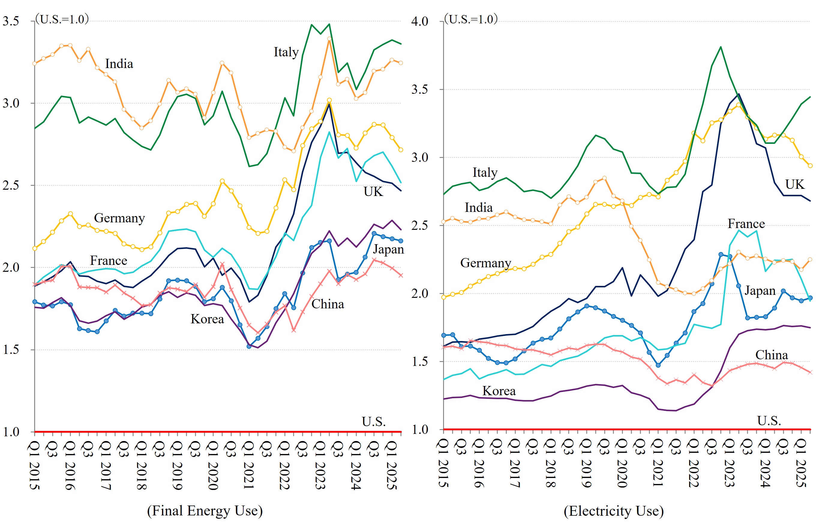 The ECM provides a high-frequency indicator — Real Unit Energy Cost (RUEC) and Real Price Level Index for energy (Real PLI) — to measure and compare real energy cost differentials across nine countries: four in Asia (China, India, Japan, and Korea), and four in Europe (France, Germany, Italy, and the UK), and the U.S. The ECM also releases the EITE (Energy-Intensive Trade-Exposed) Output Index.