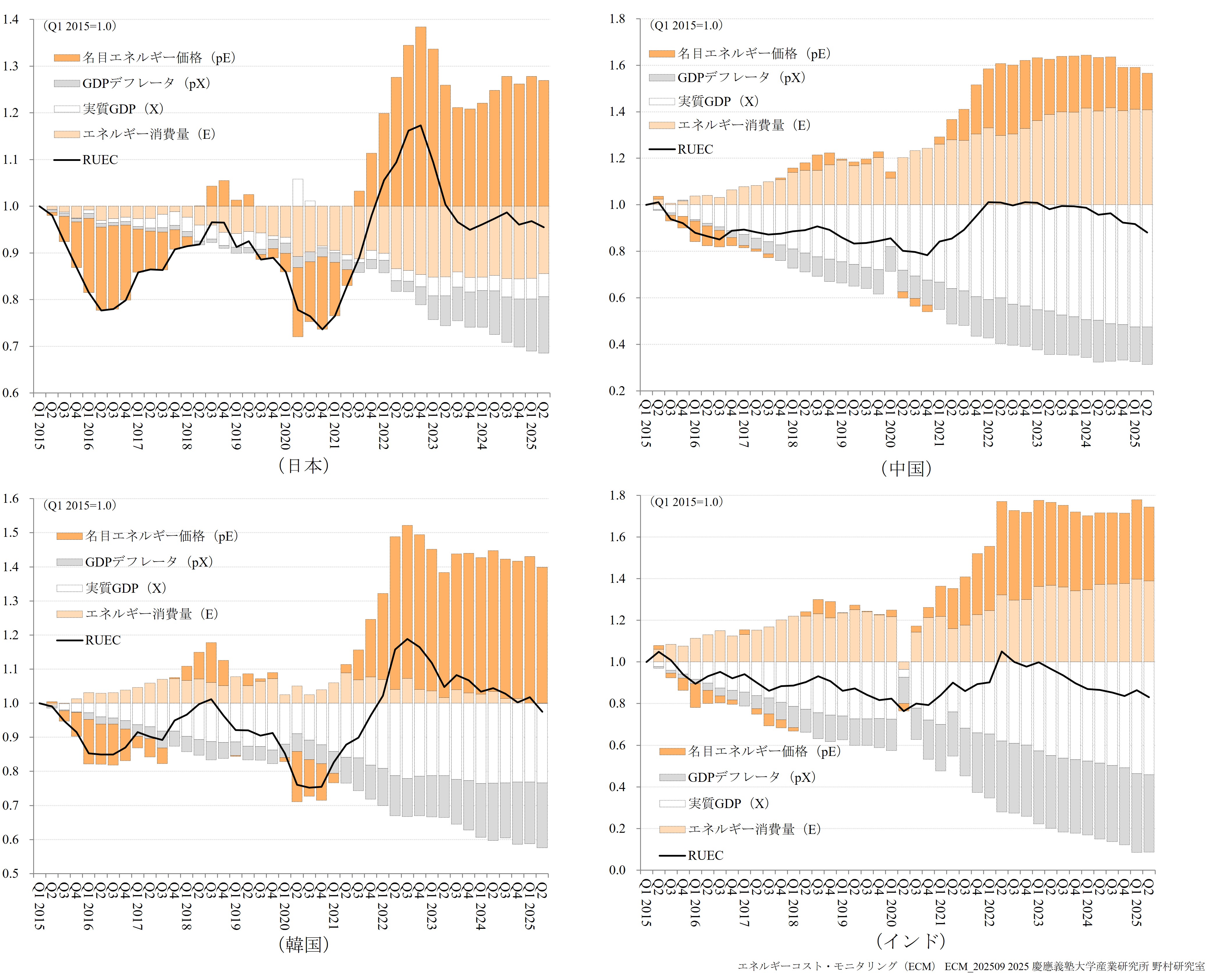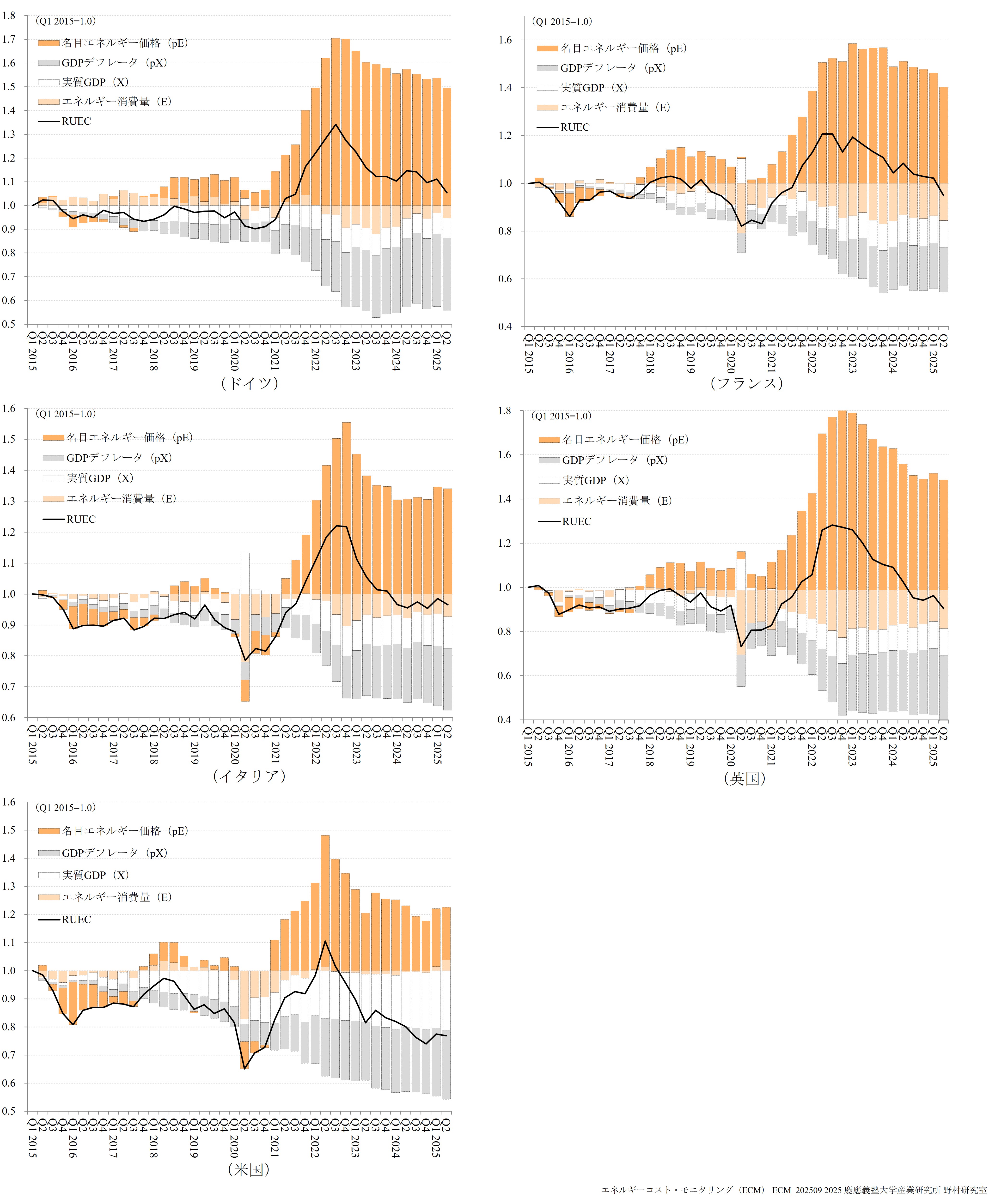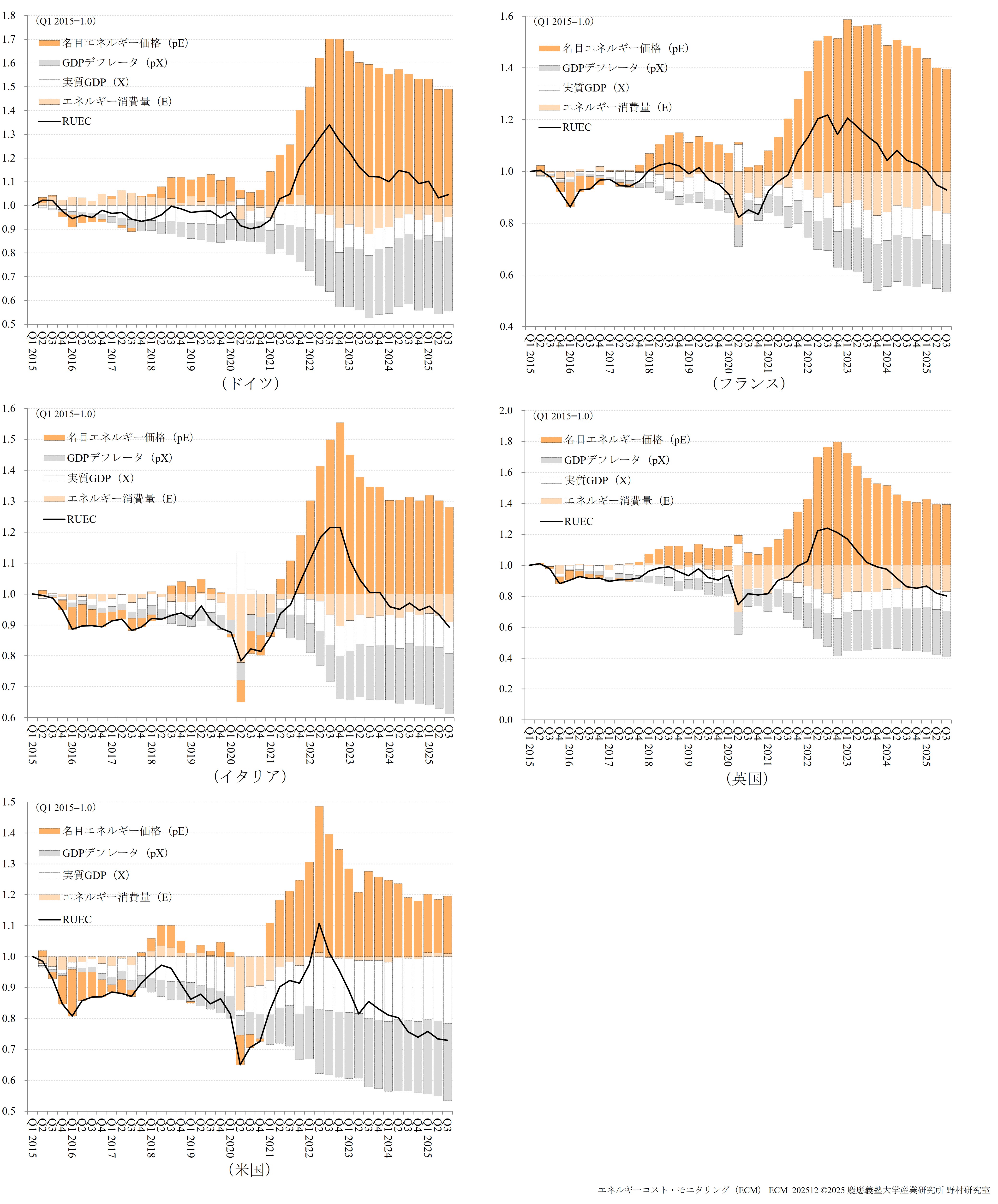 ECMは、日本、中国、韓国、インド、米国、フランス、ドイツ、イタリア、英国の9か国を対象に、実質エネルギーコストの国際的な格差を高頻度で測定する指標として実質単位エネルギーコスト(RUEC)および実質的な内外価格差(Real PLI)の速報値を公表しています。 さらに、エネルギー価格高騰やエネルギー環境政策の影響を受けたエネルギー多消費(EITE)製造業の生産・輸入指数に関しても、併せて公表しています。