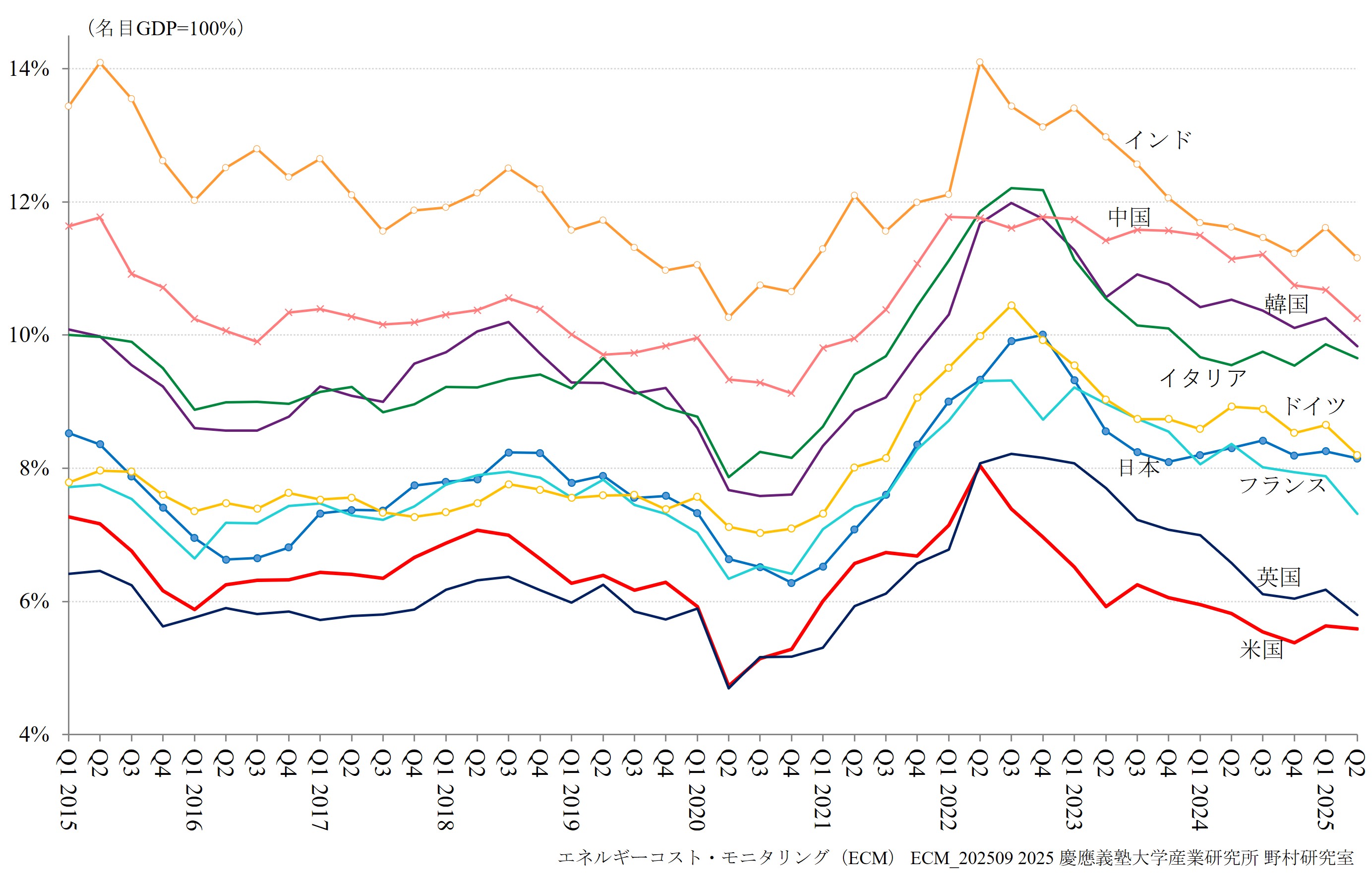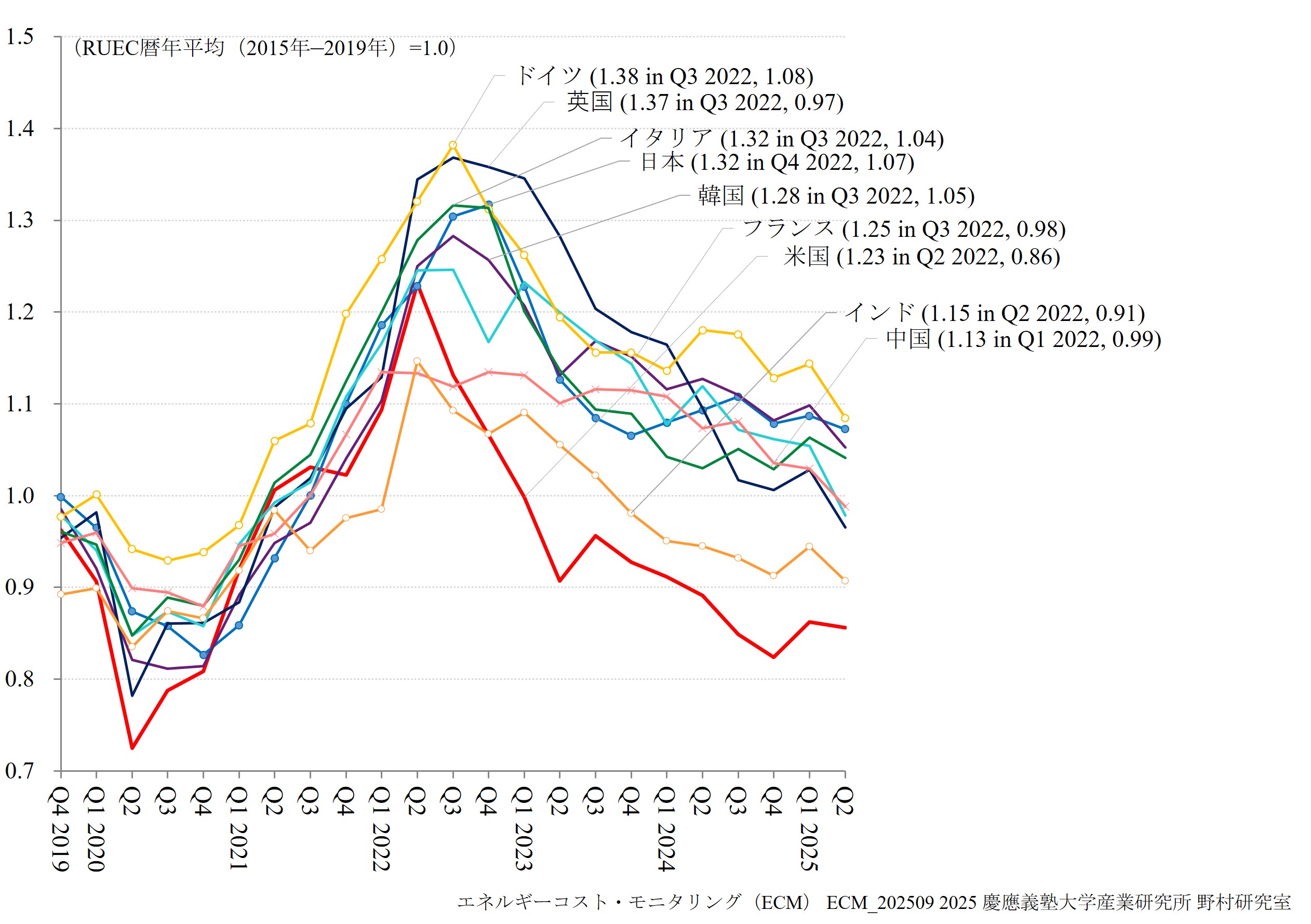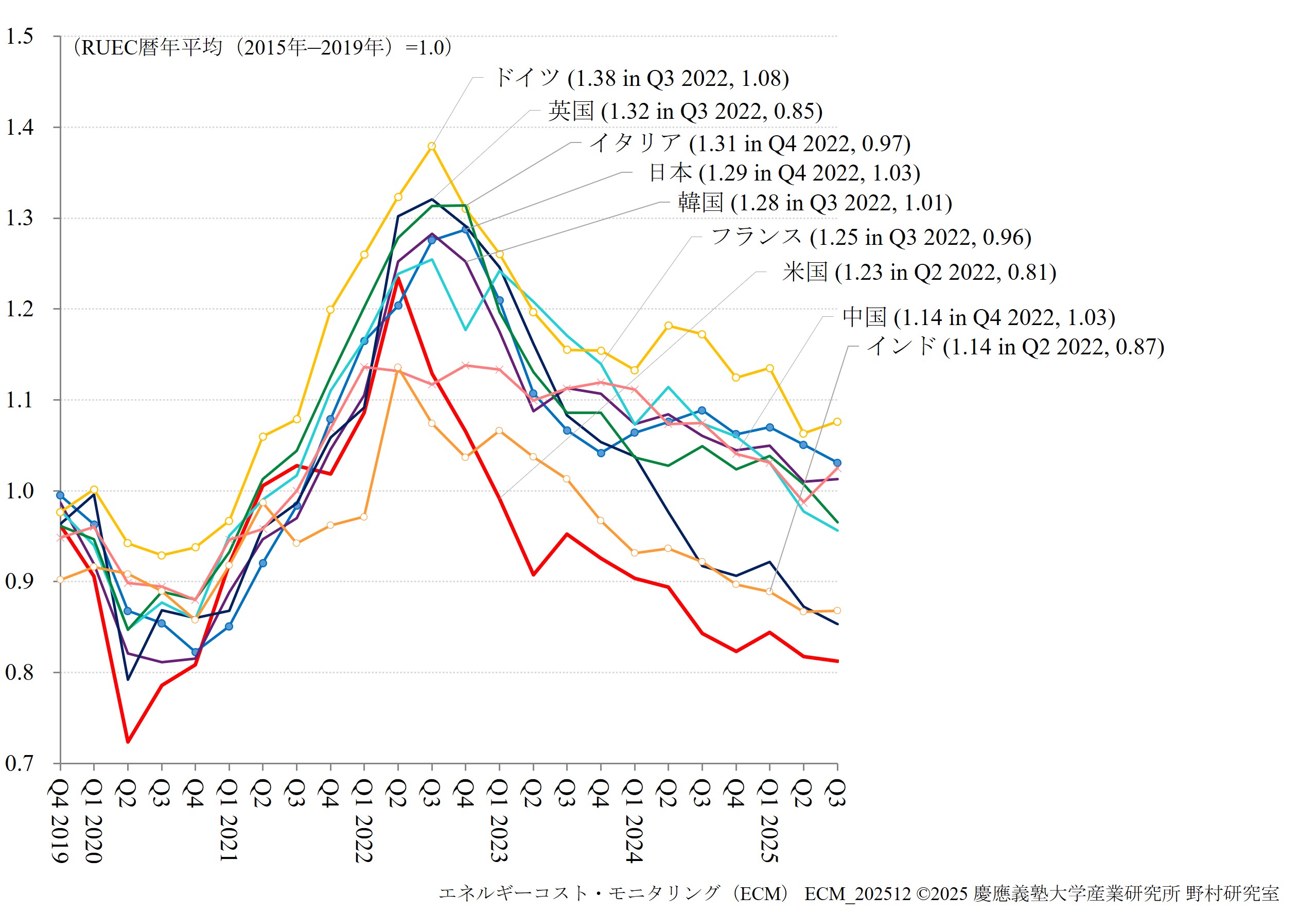 ECMは、日本、中国、韓国、インド、米国、フランス、ドイツ、イタリア、英国の9か国を対象に、実質エネルギーコストの国際的な格差を高頻度で測定する指標として実質単位エネルギーコスト(RUEC)および実質的な内外価格差(Real PLI)の速報値を公表しています。 さらに、エネルギー価格高騰やエネルギー環境政策の影響を受けたエネルギー多消費(EITE)製造業の生産・輸入指数に関しても、併せて公表しています。