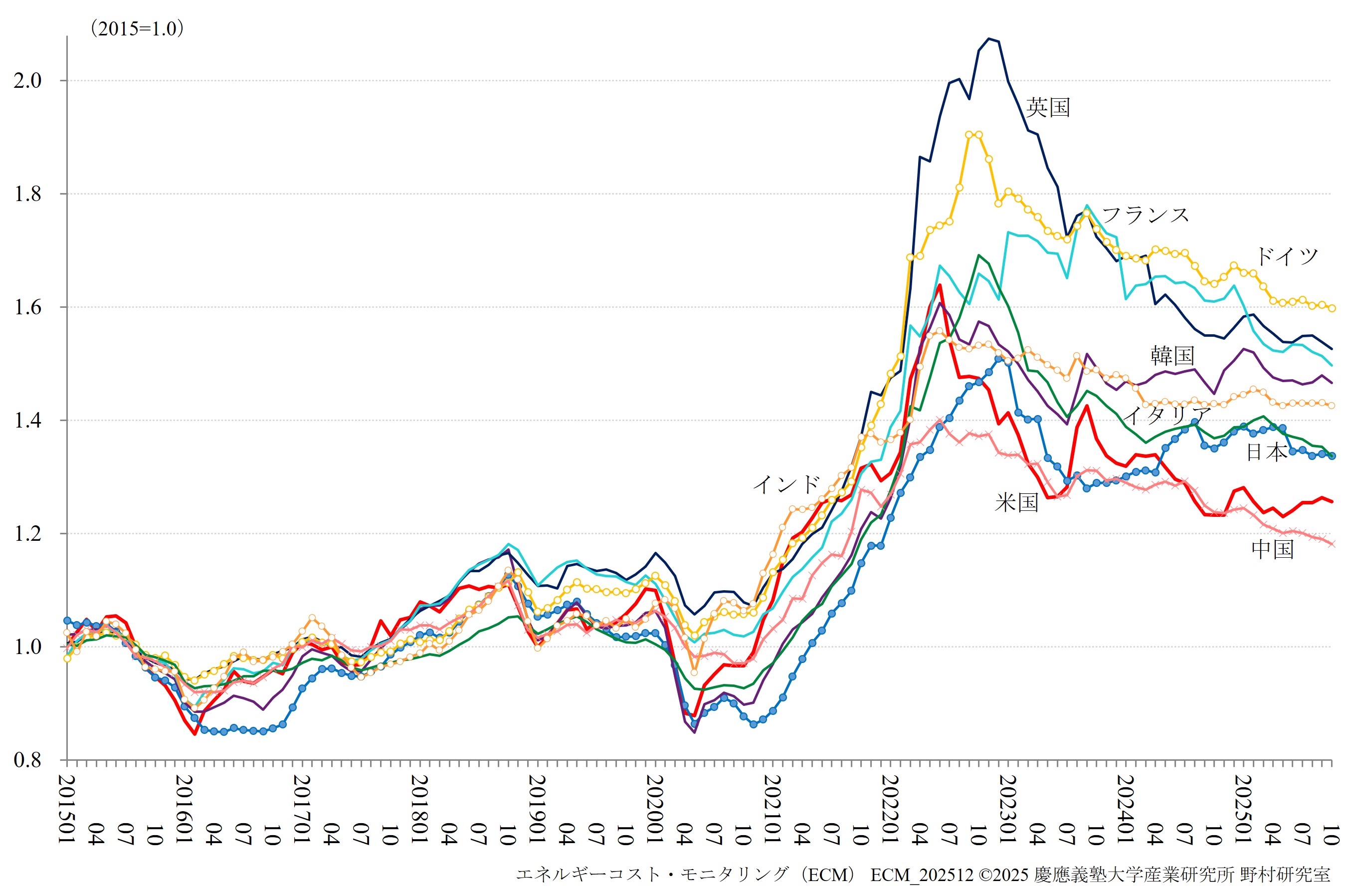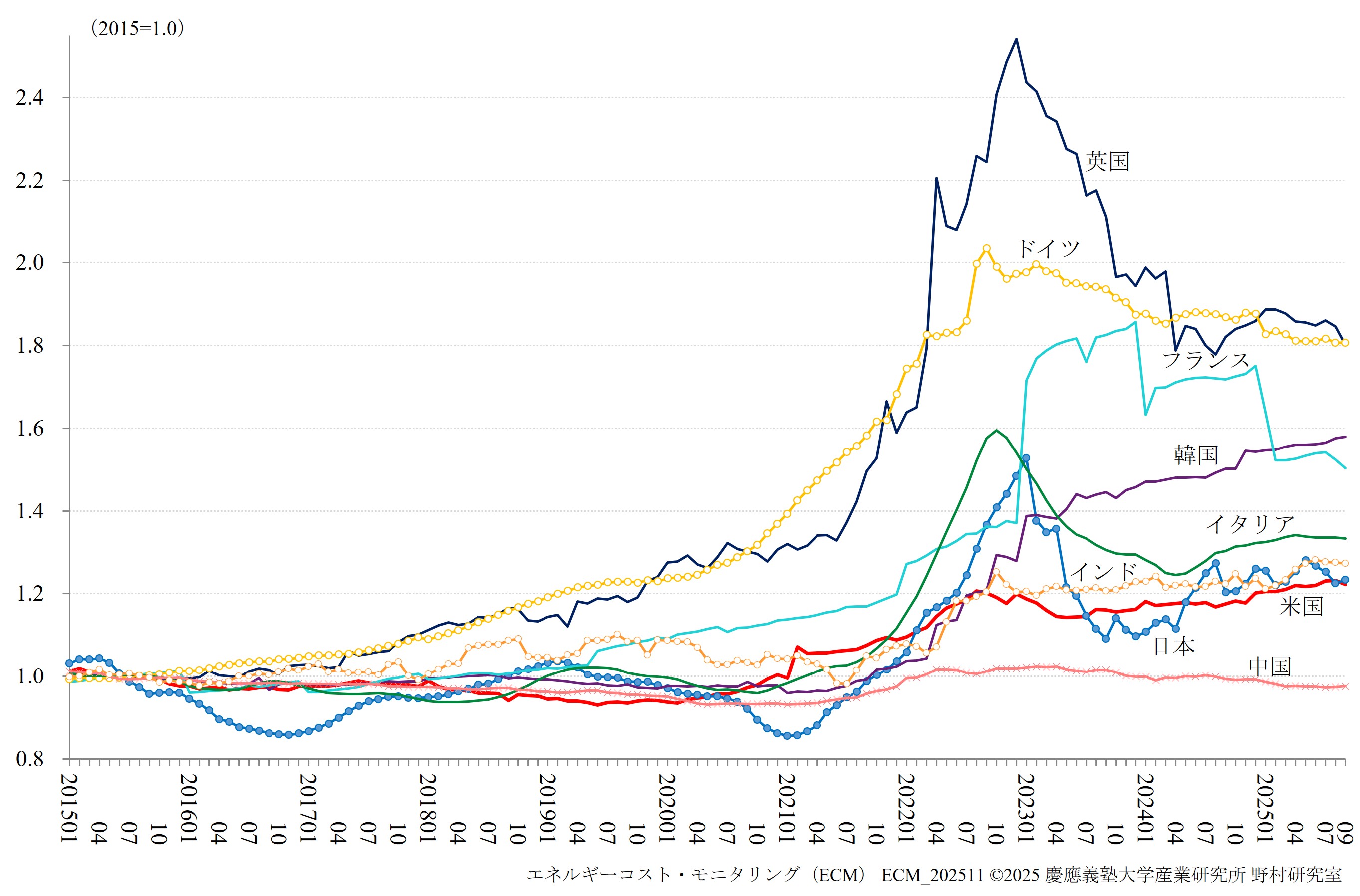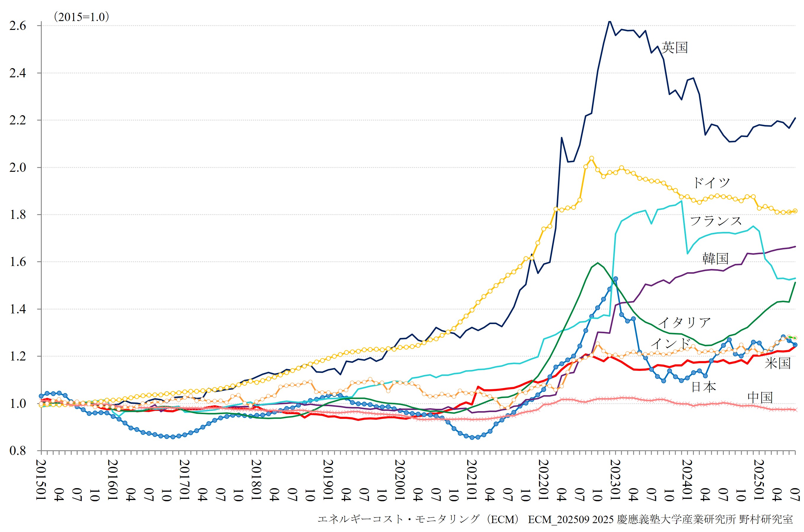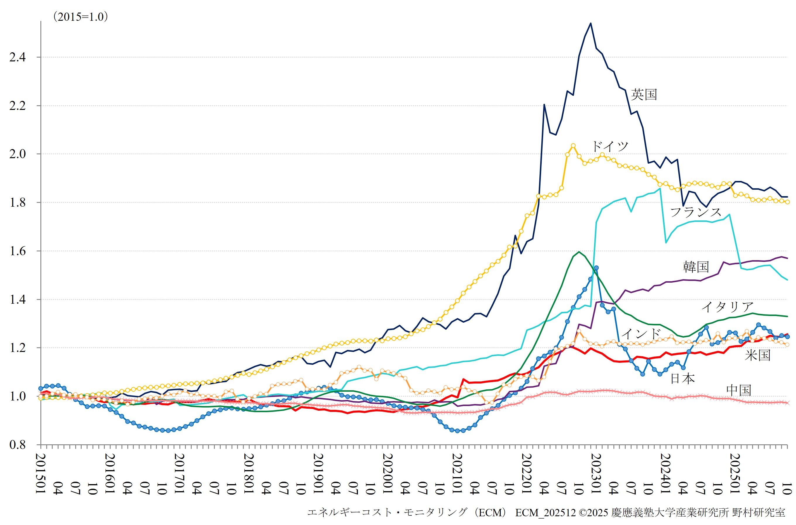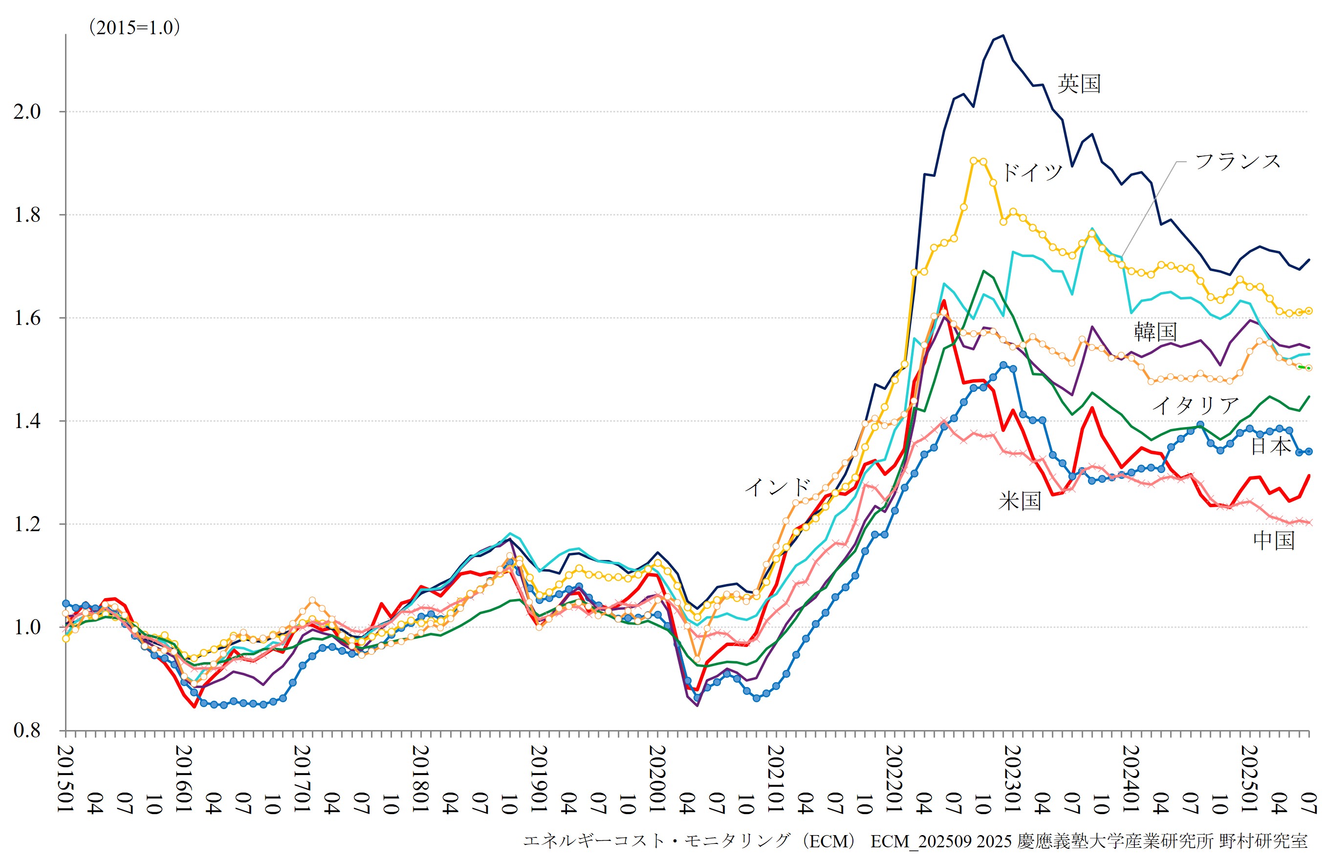 ECMは、日本、中国、韓国、インド、米国、フランス、ドイツ、イタリア、英国の9か国を対象に、実質エネルギーコストの国際的な格差を高頻度で測定する指標として実質単位エネルギーコスト(RUEC)および実質的な内外価格差(Real PLI)の速報値を公表しています。 さらに、エネルギー価格高騰やエネルギー環境政策の影響を受けたエネルギー多消費(EITE)製造業の生産・輸入指数に関しても、併せて公表しています。