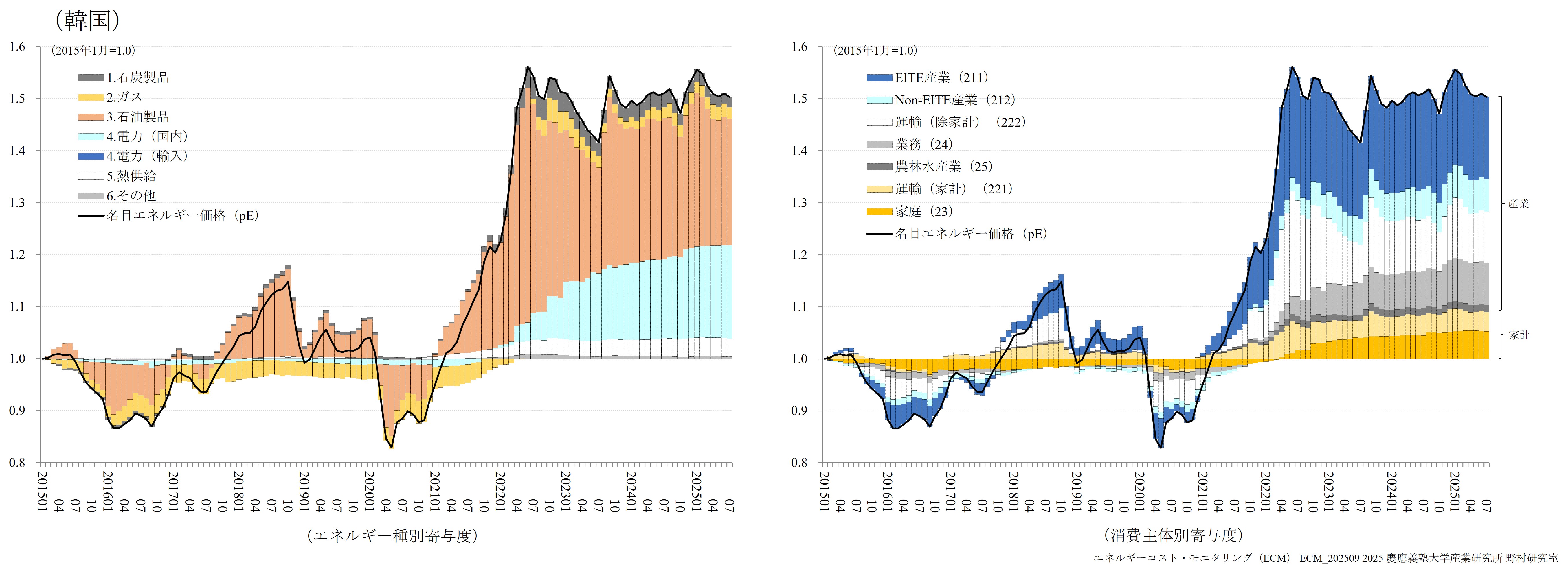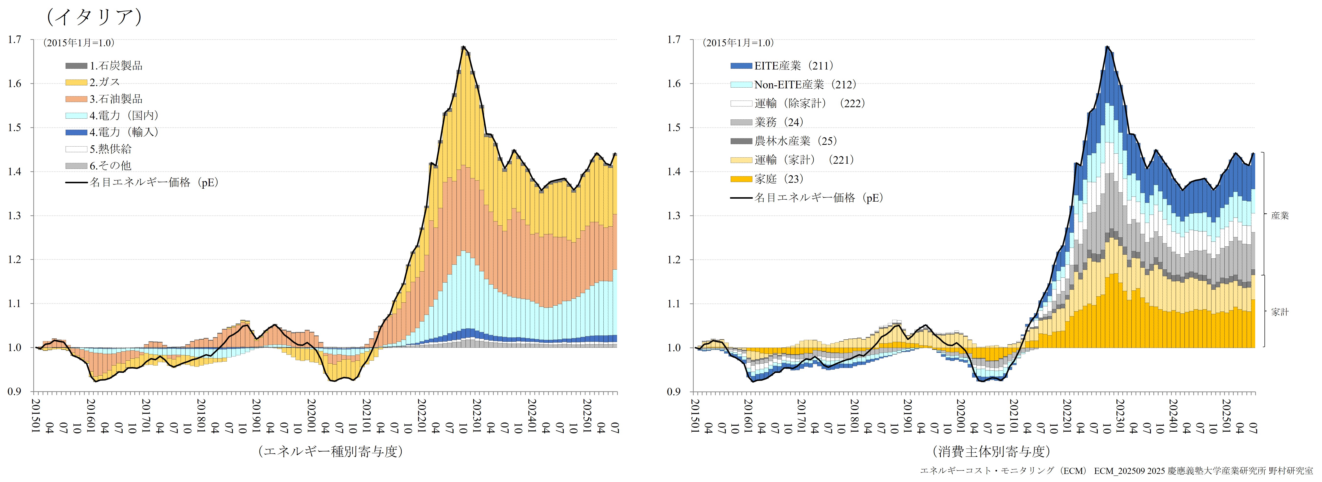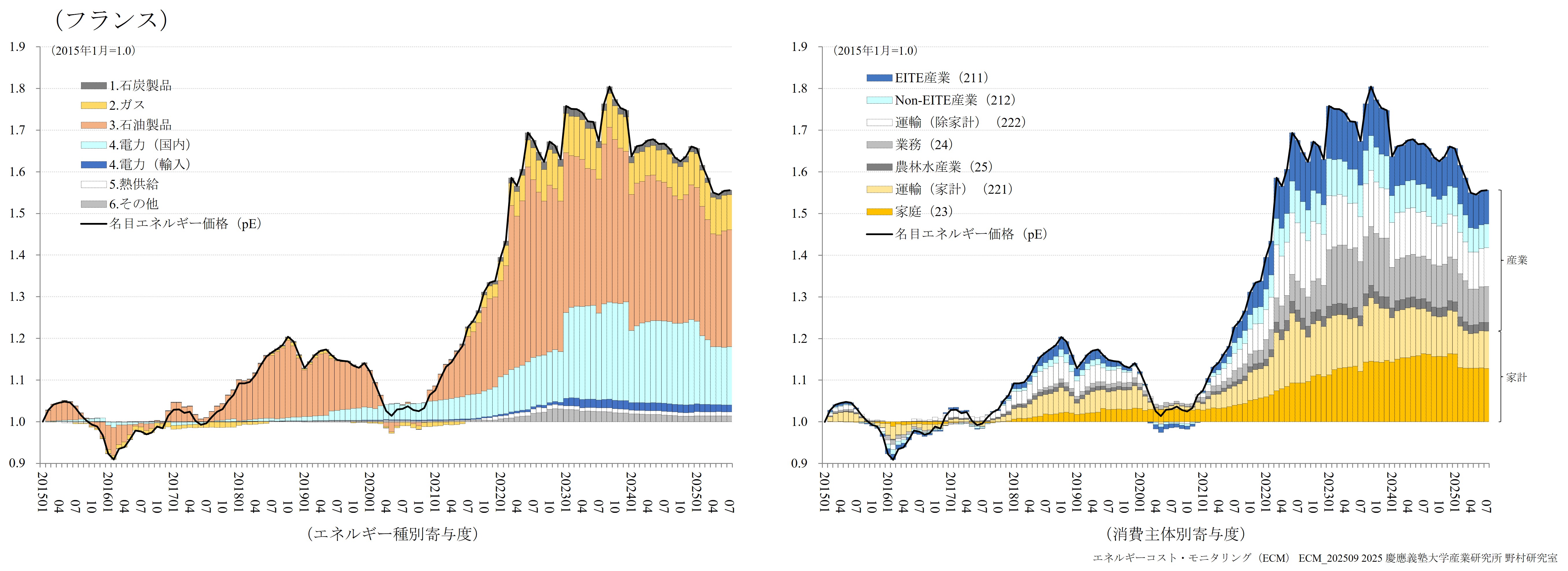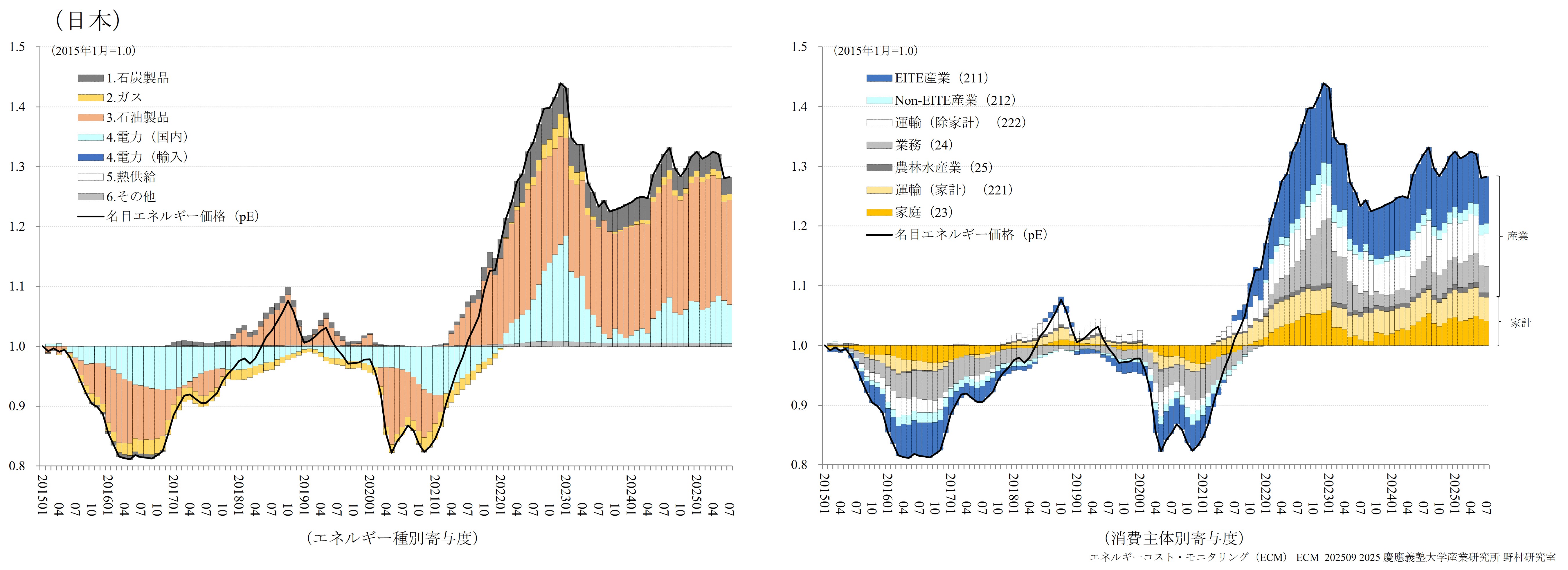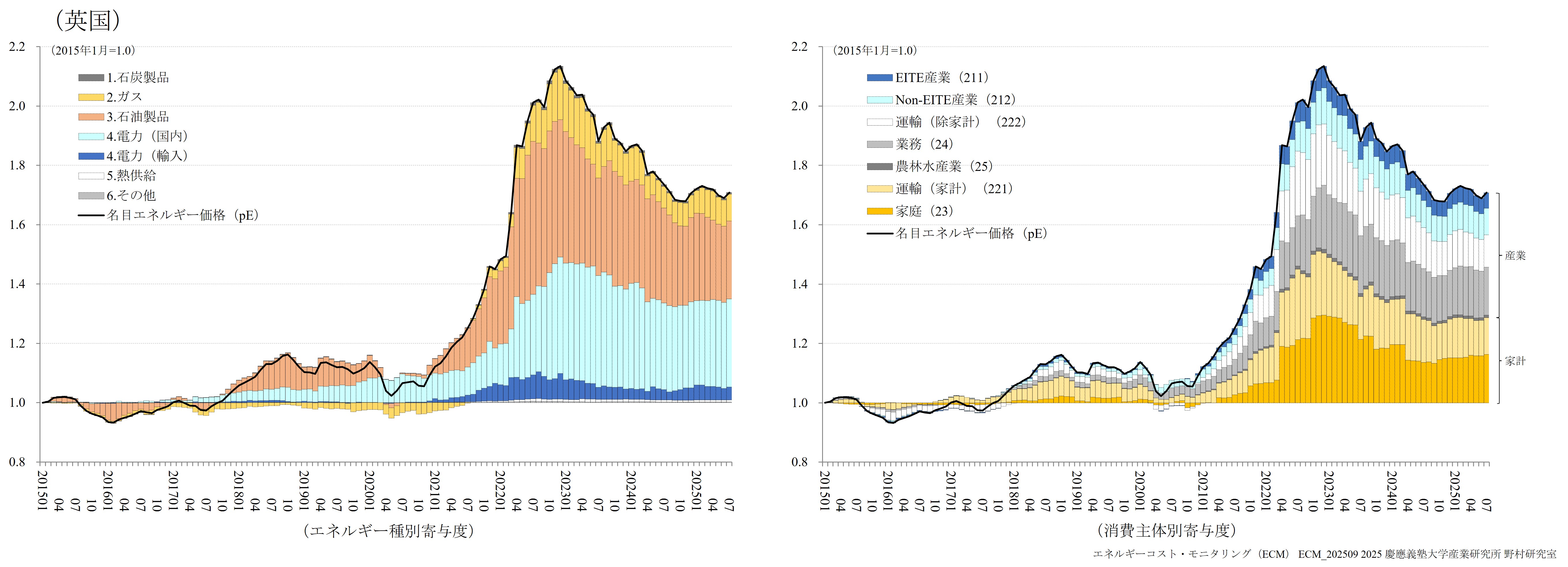ECMは、日本、中国、韓国、インド、米国、フランス、ドイツ、イタリア、英国の9か国を対象に、実質エネルギーコストの国際的な格差を高頻度で測定する指標として実質単位エネルギーコスト(RUEC)および実質的な内外価格差(Real PLI)の速報値を公表しています。 さらに、エネルギー価格高騰やエネルギー環境政策の影響を受けたエネルギー多消費(EITE)製造業の生産・輸入指数に関しても、併せて公表しています。