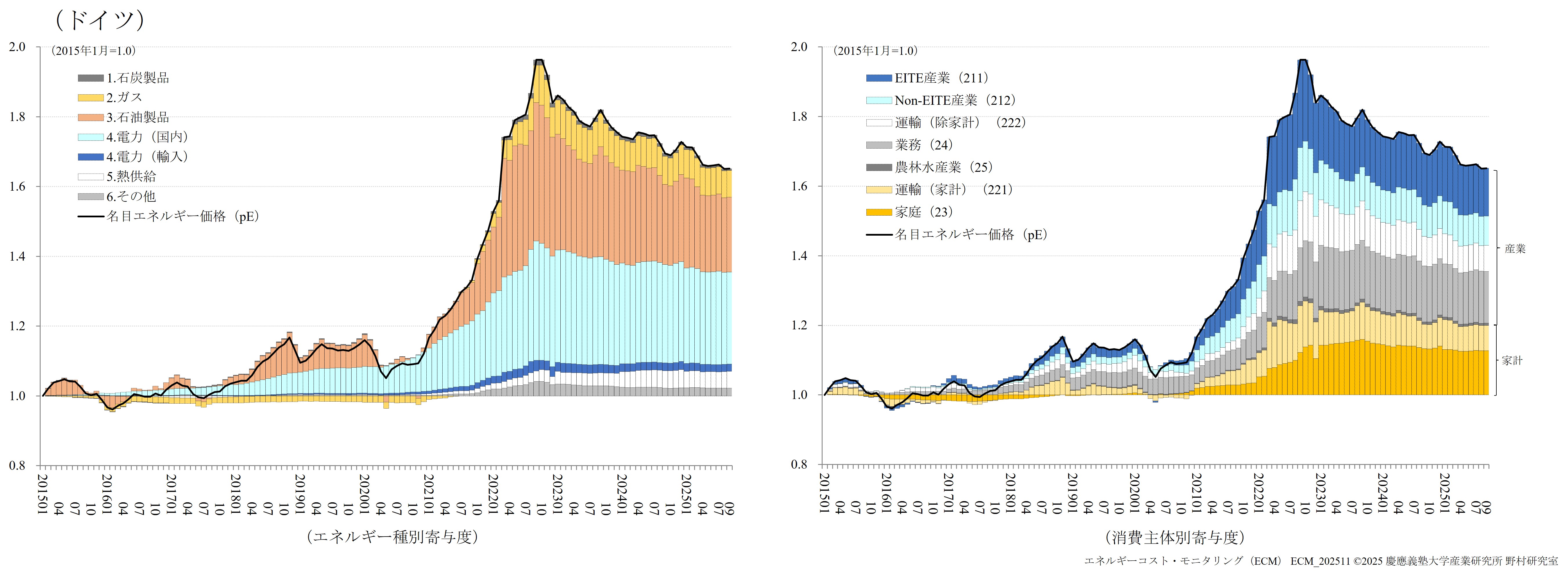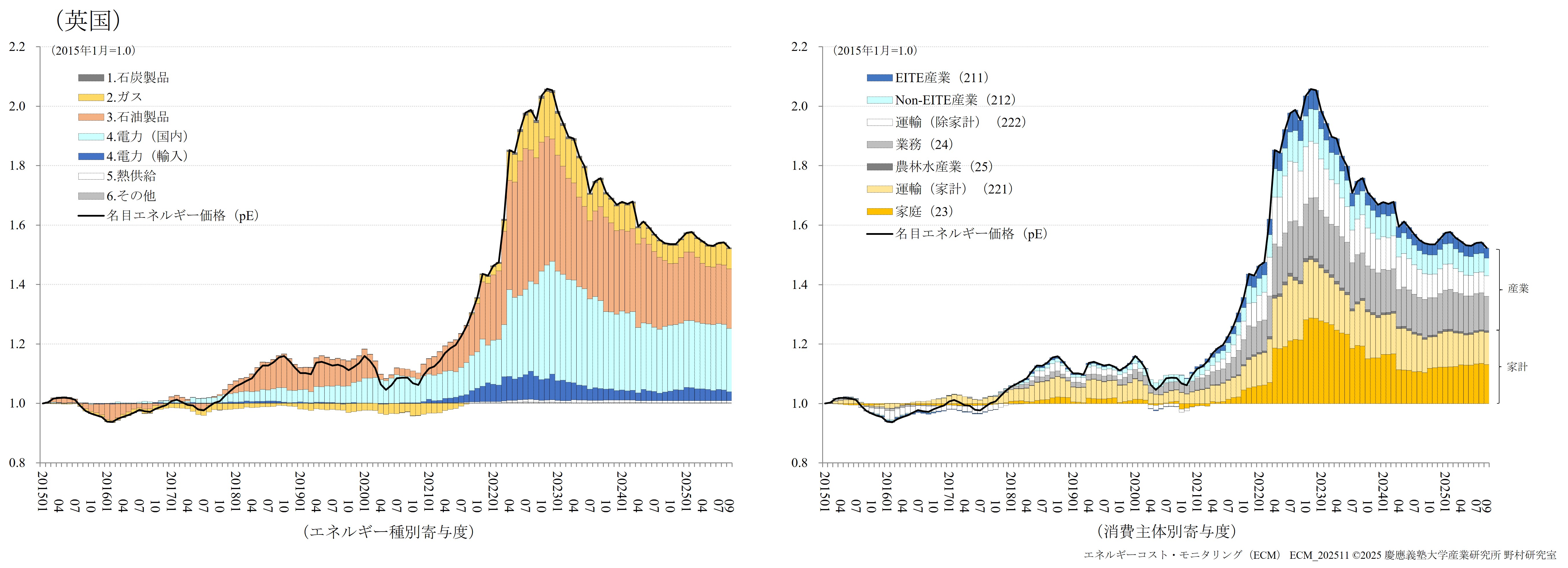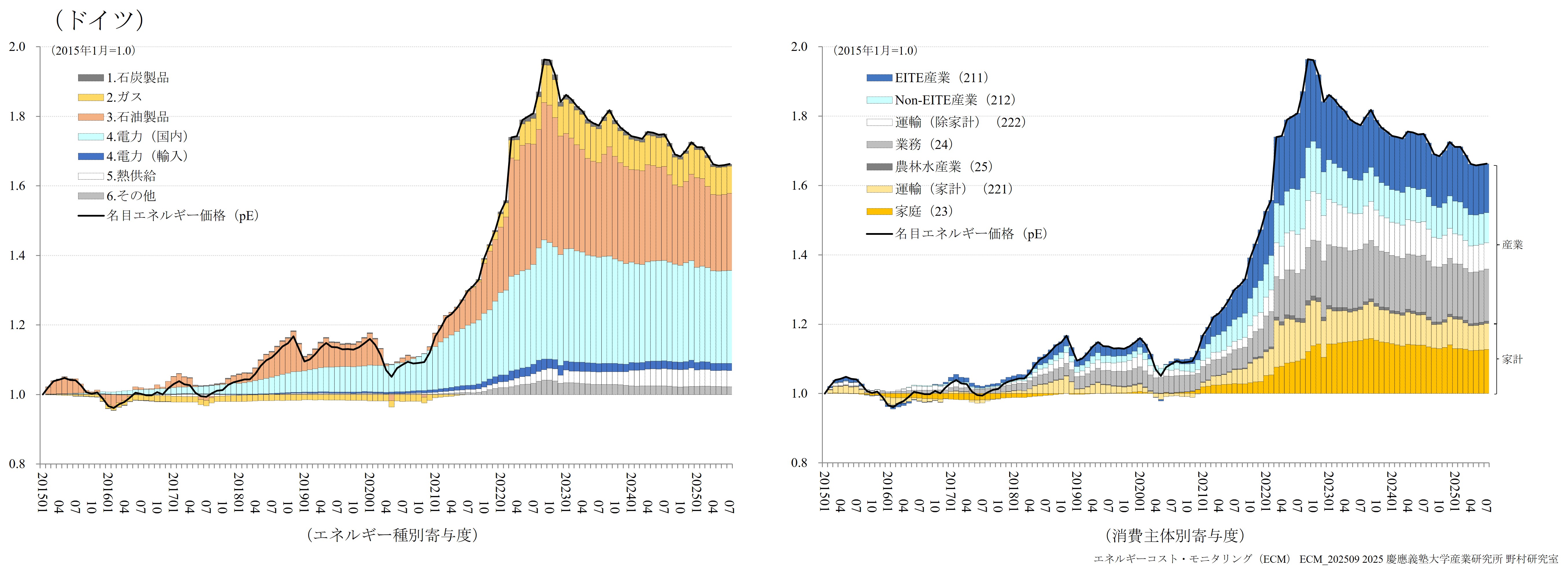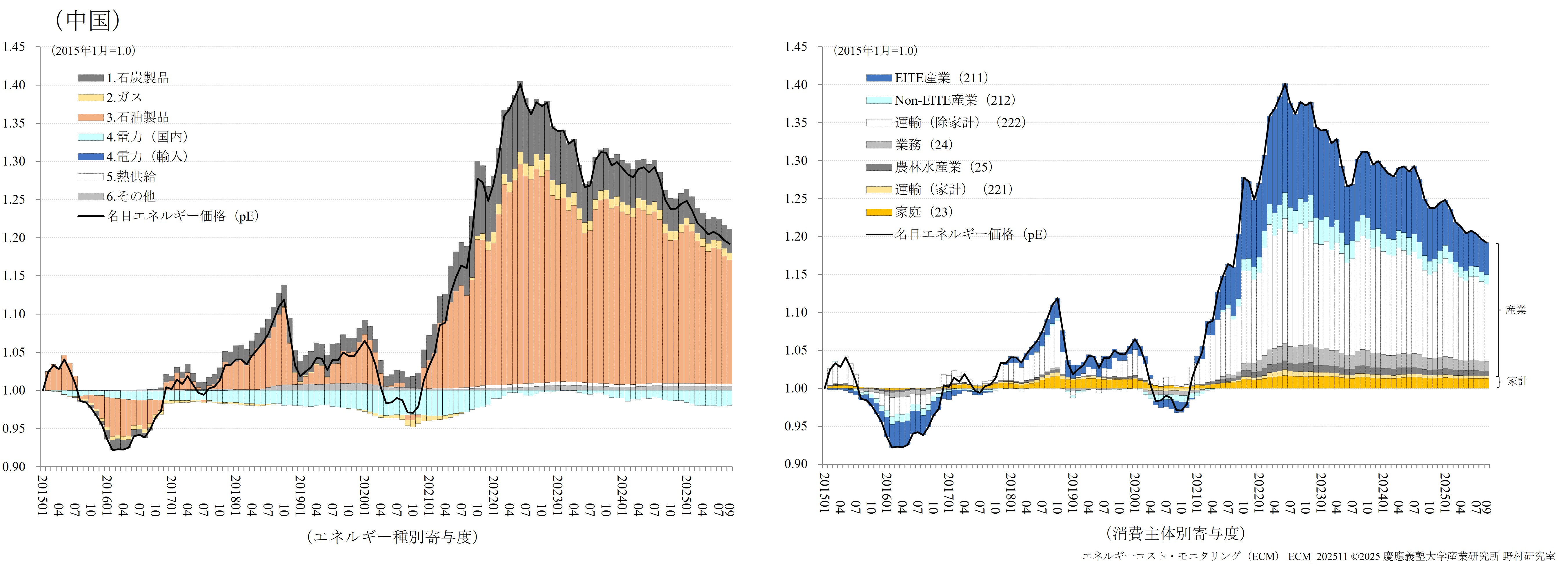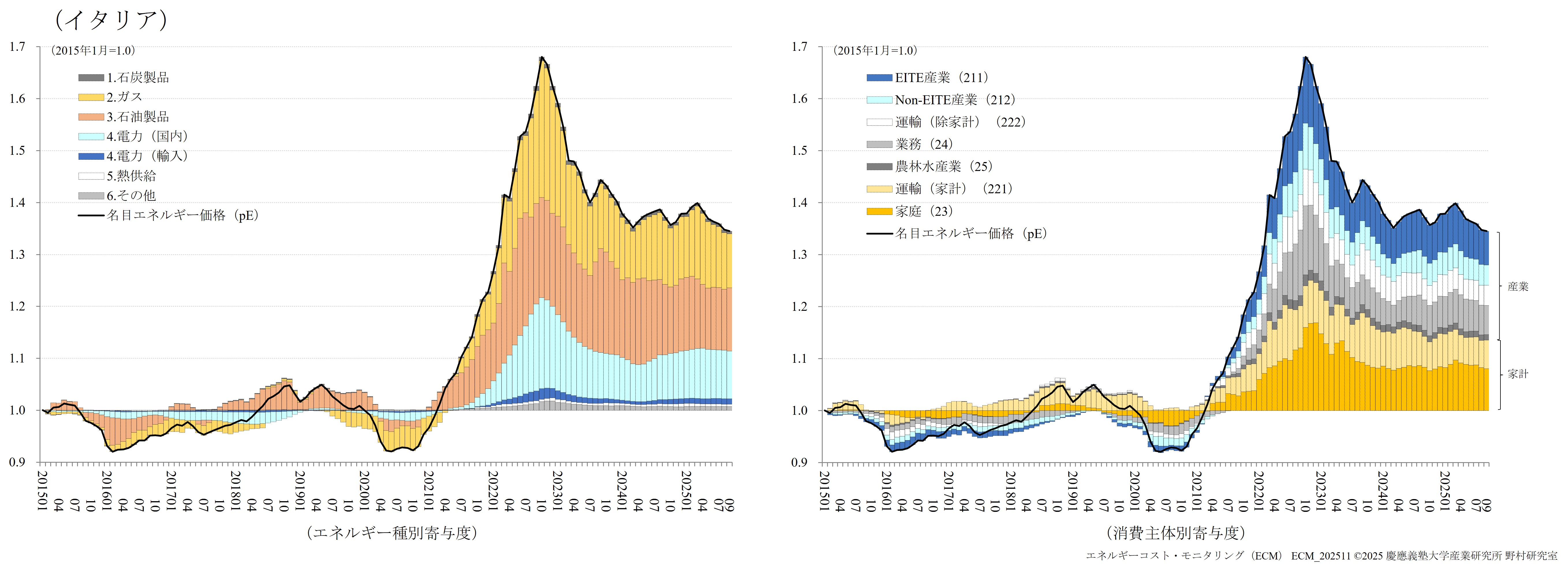 ECMは、日本、中国、韓国、インド、米国、フランス、ドイツ、イタリア、英国の9か国を対象に、実質エネルギーコストの国際的な格差を高頻度で測定する指標として実質単位エネルギーコスト(RUEC)および実質的な内外価格差(Real PLI)の速報値を公表しています。 さらに、エネルギー価格高騰やエネルギー環境政策の影響を受けたエネルギー多消費(EITE)製造業の生産・輸入指数に関しても、併せて公表しています。