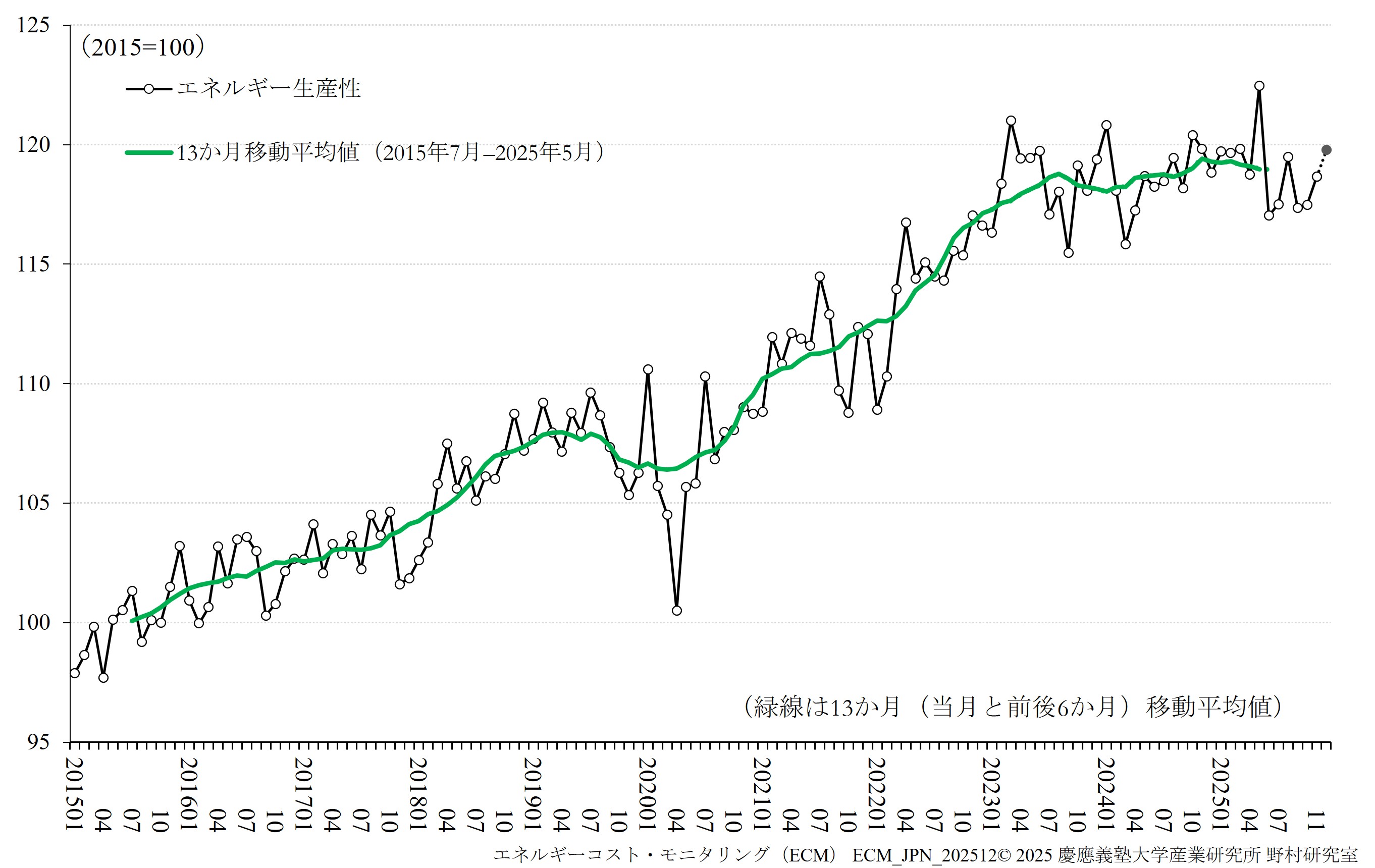- エネルギー生産性の13か月移動平均値(緑線)の期間平均成長率(2015年7月―2025年5月)は年率1.8%の上昇。