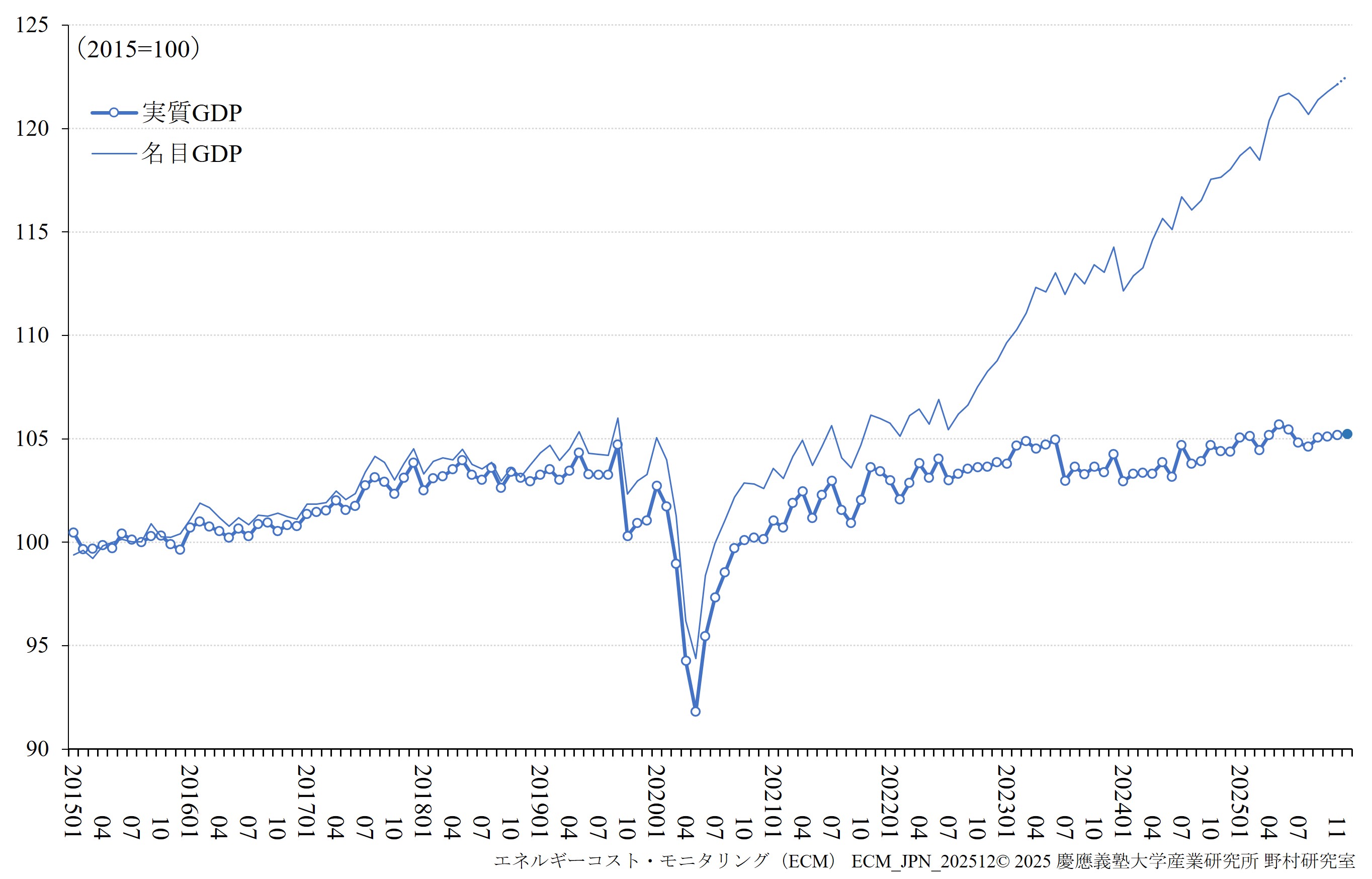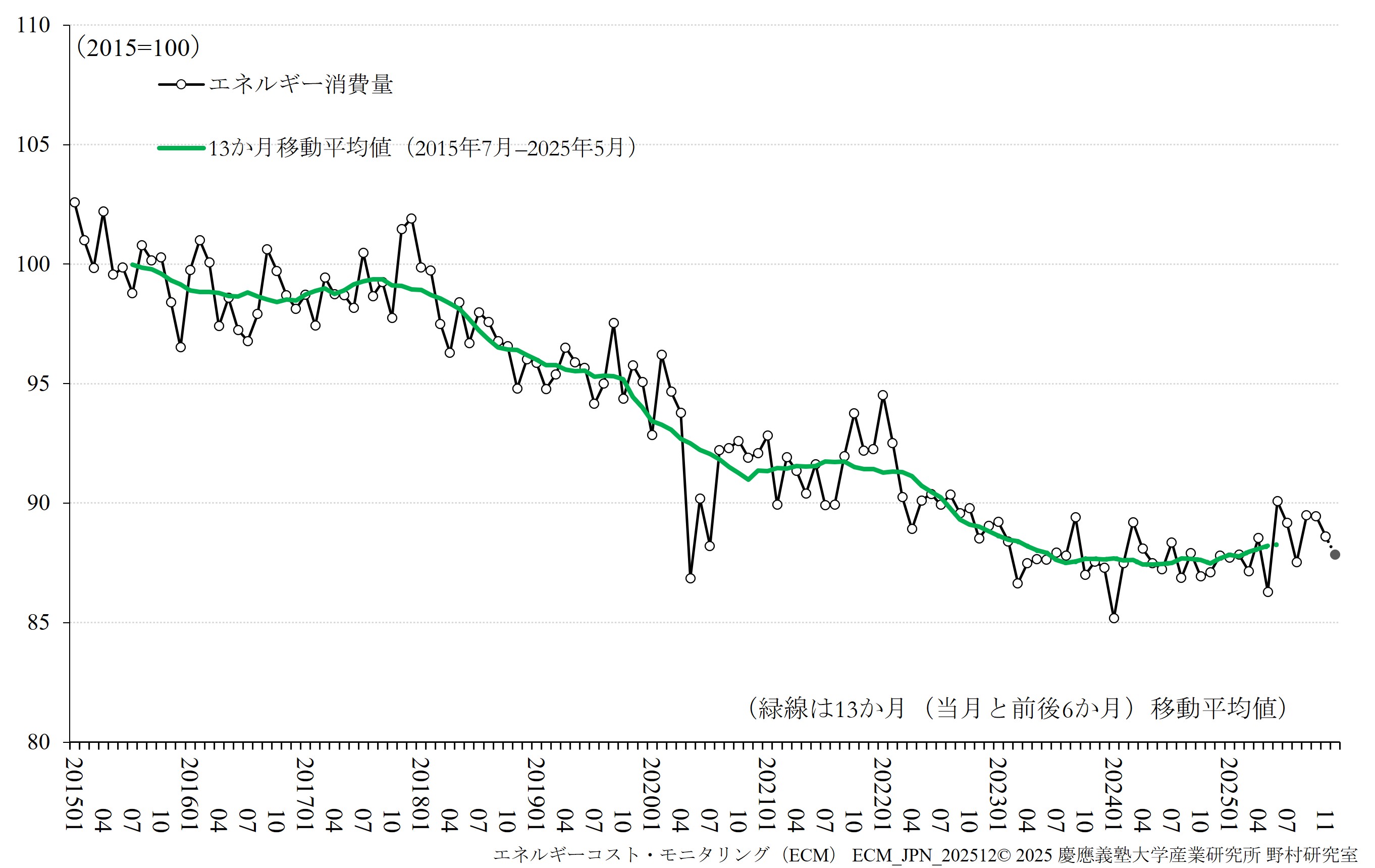 - エネルギー消費量はコロナショックからの回復基調を終え、2025年11月では2015暦年平均より11.4%少ない。