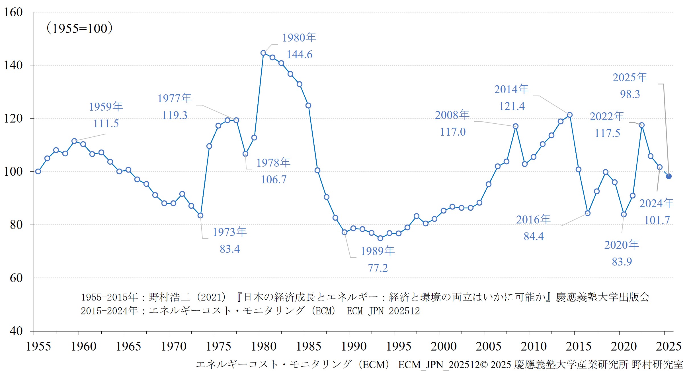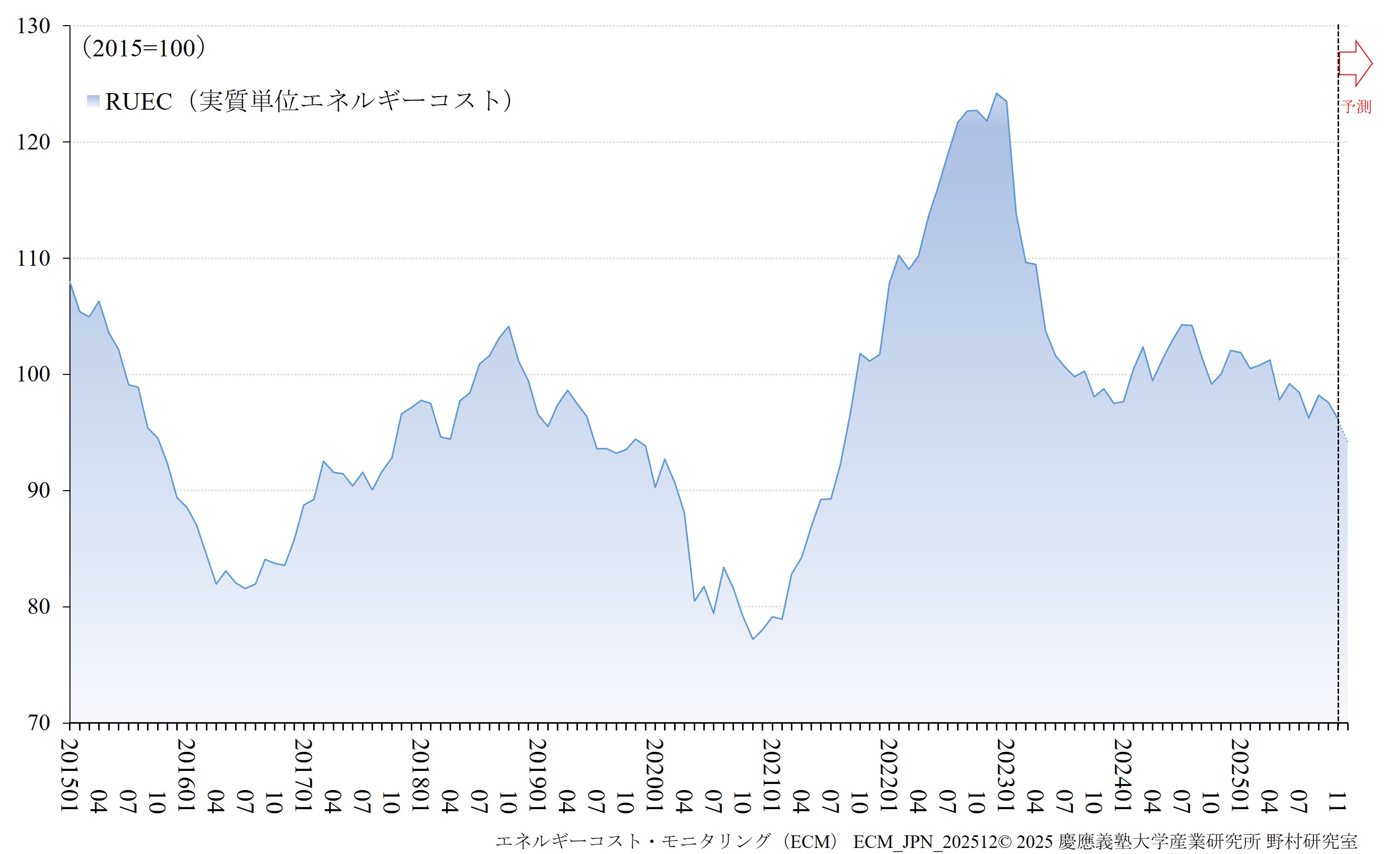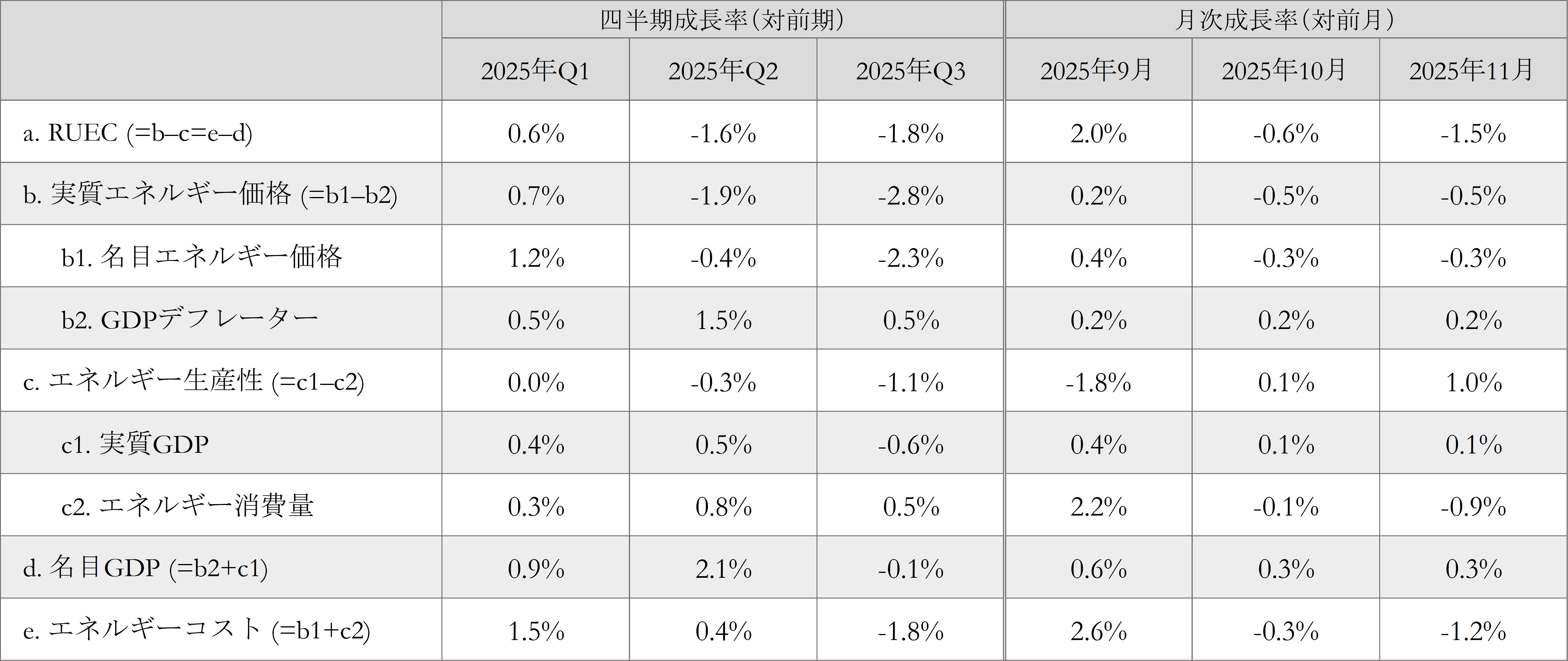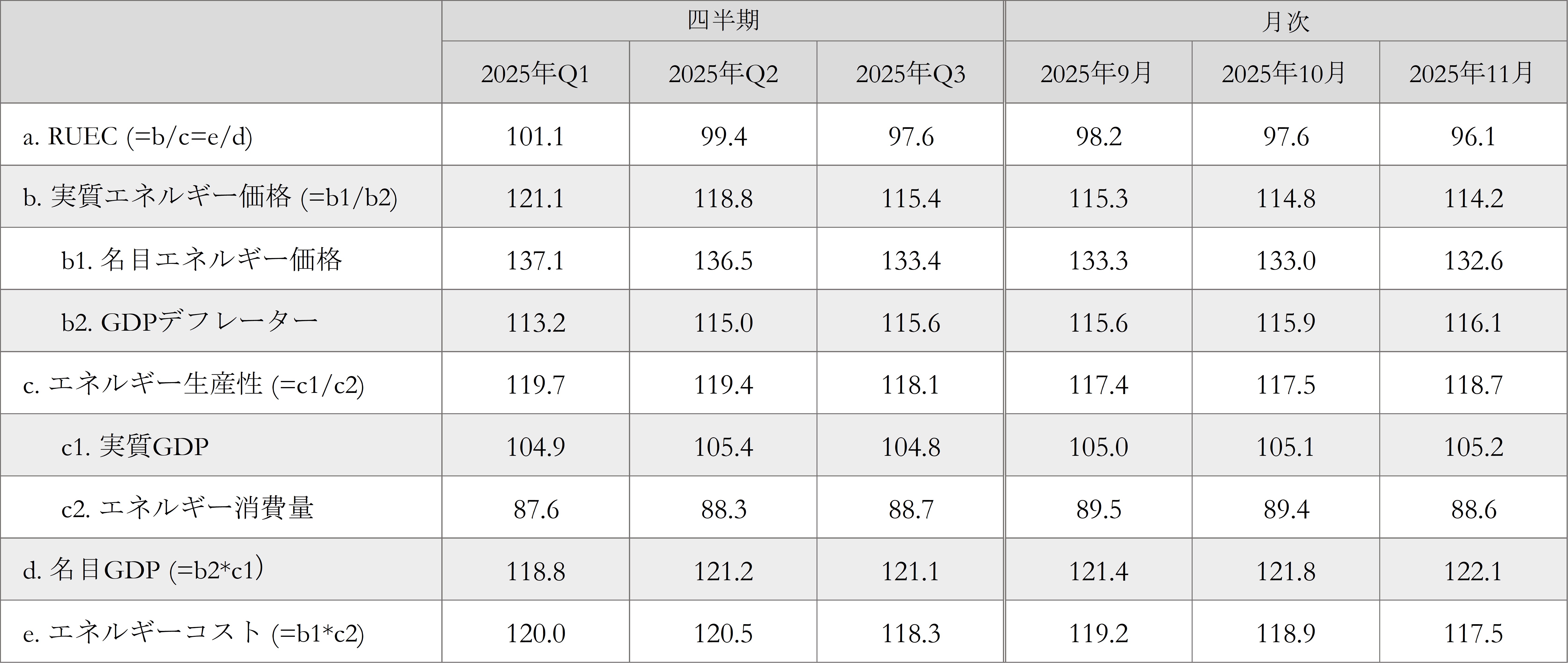 - 2025年11月のRUECは、実質エネ価格0.5%の下落、エネ生産性1.0%の増加により、前月比1.5%減少。
