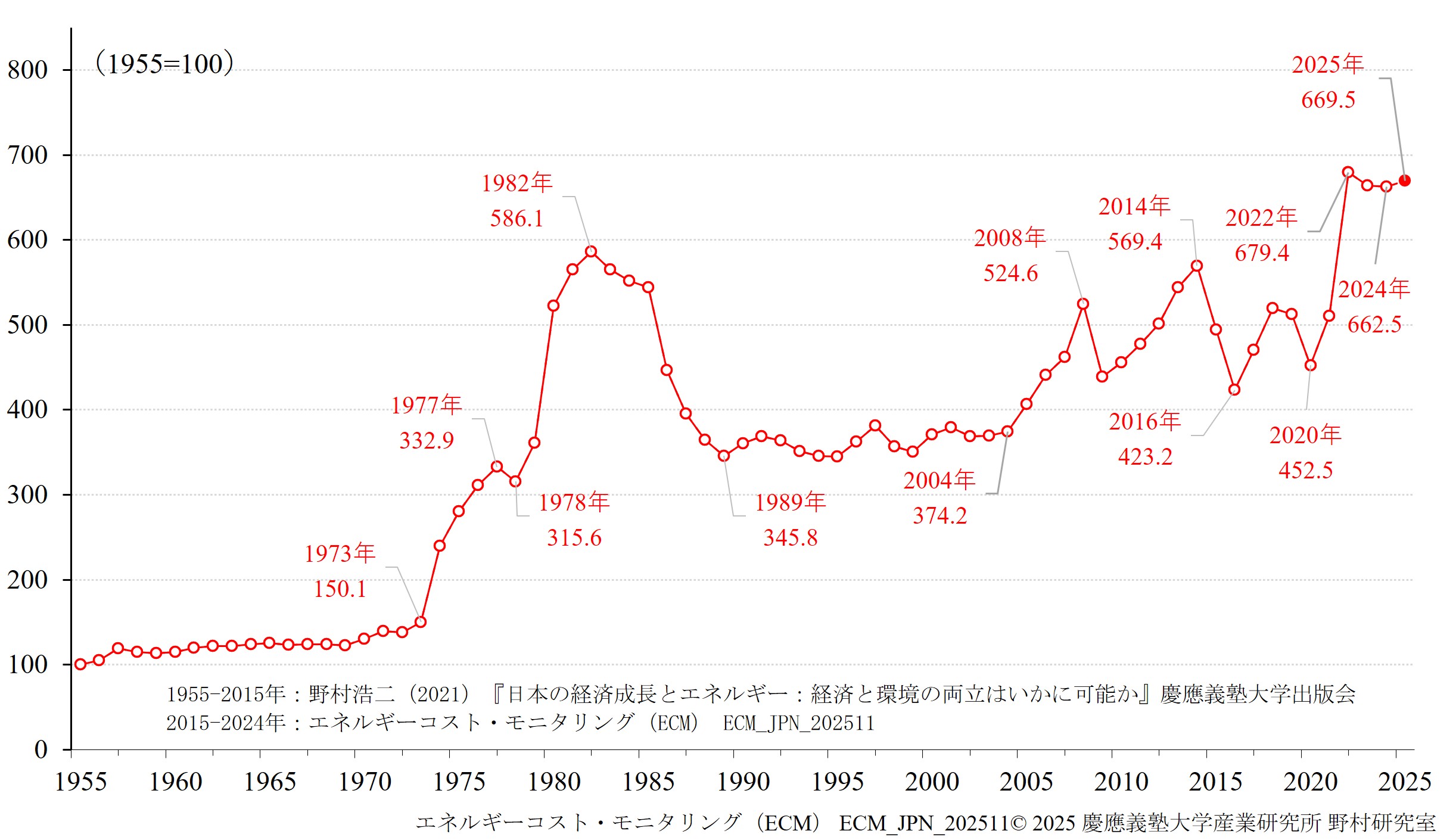 日本経済が負担するエネルギーコストの総額とその構造、さらにエネルギー価格の変化が経済に及ぼす実質的な影響を集約した指標である実質単位エネルギーコスト(RUEC)を中心に、 日本のエネルギー消費量と価格の動向を約1か月のタイムラグで把握する月次速報値を推計しています。